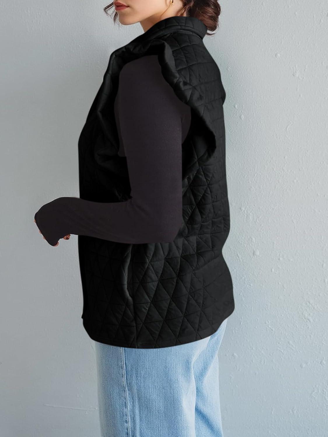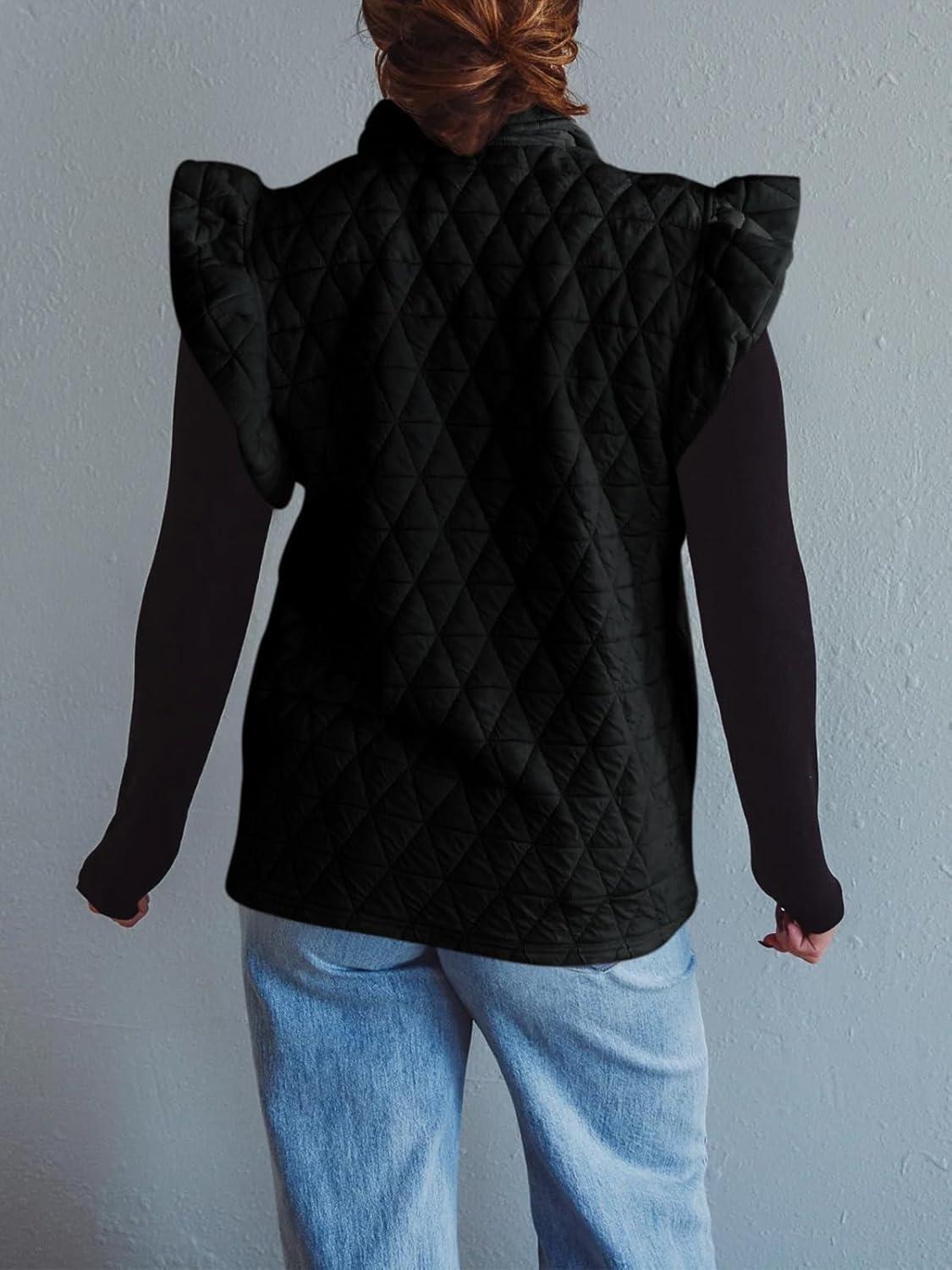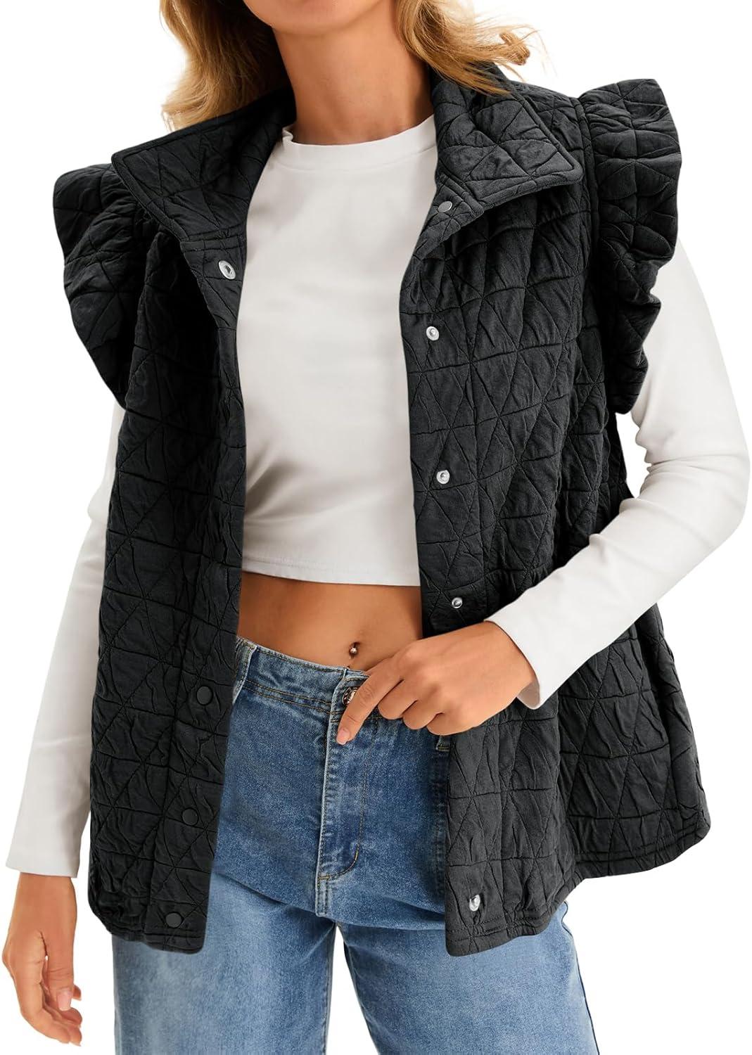 Cicy Bell Women Ruffles Puffer Vest Sleeveless Button Down Padded Jacket Gilet Trendy Spring Outerwear(Black)