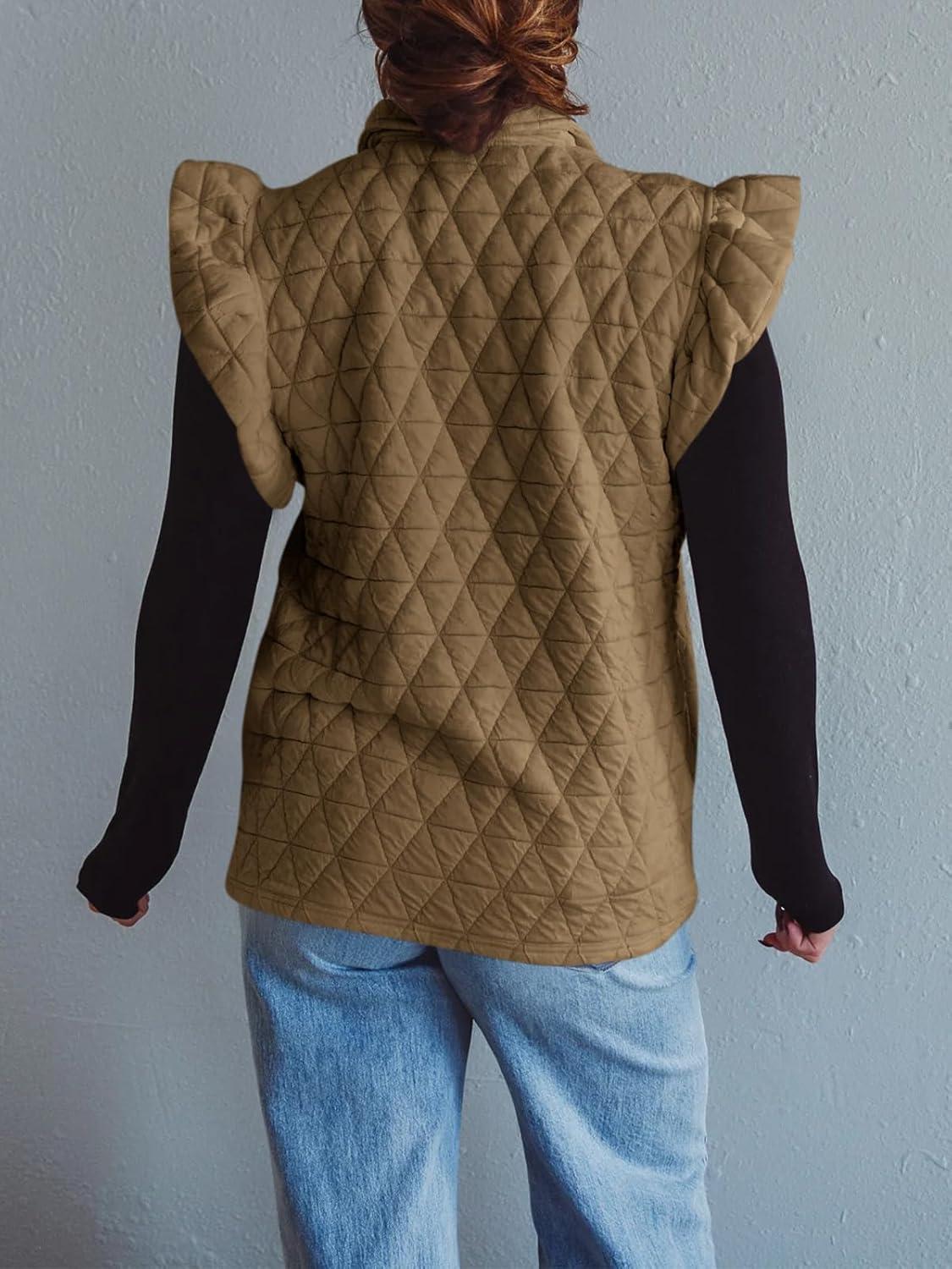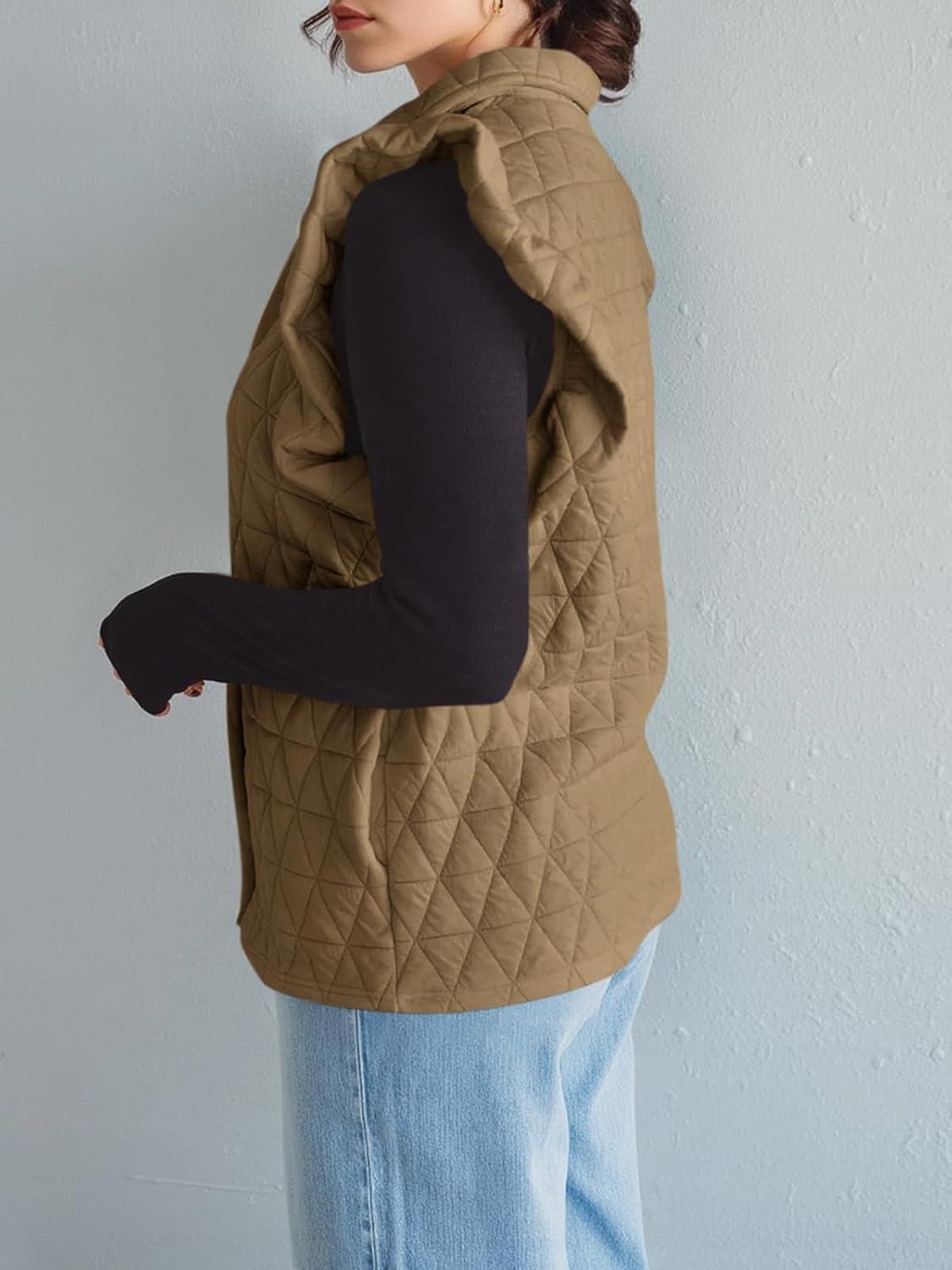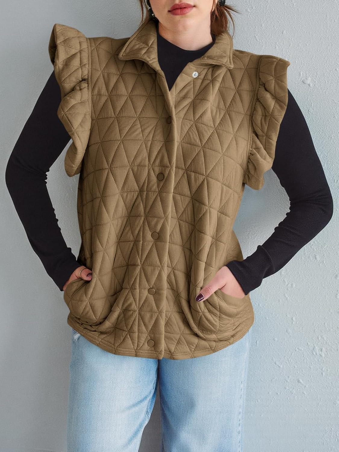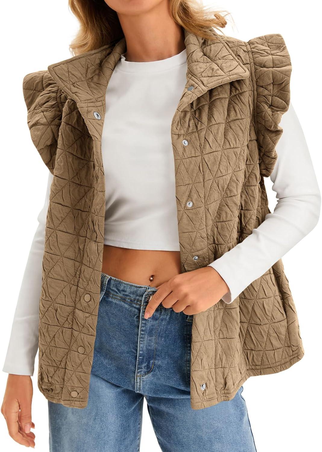 Cicy Bell Women Ruffles Puffer Vest Sleeveless Button Down Padded Jacket Gilet Trendy Spring Outerwear(Khaki)