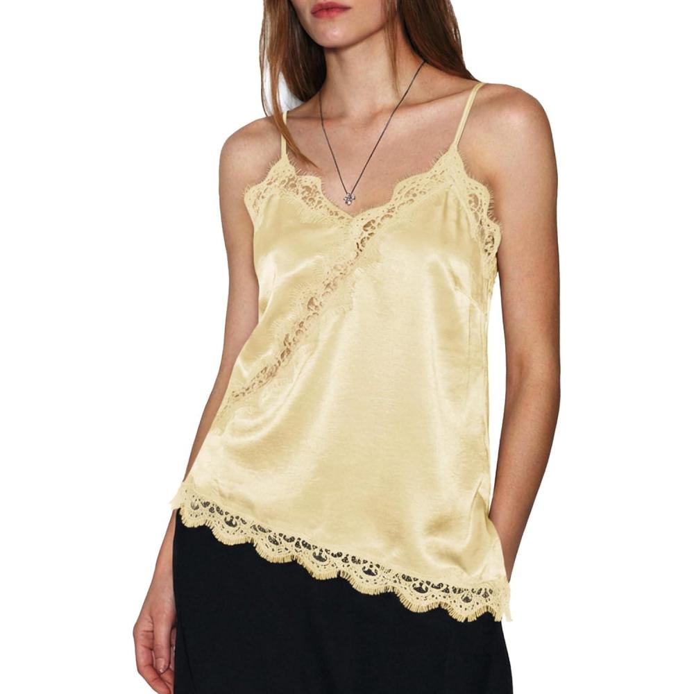 Cicy Bell Women Summer Satin Cami Tops Spaghetti Strap Lace V Neck Cute Camisole Party Pajamas Asymmetrical Hem Tank Tops(Yellow)