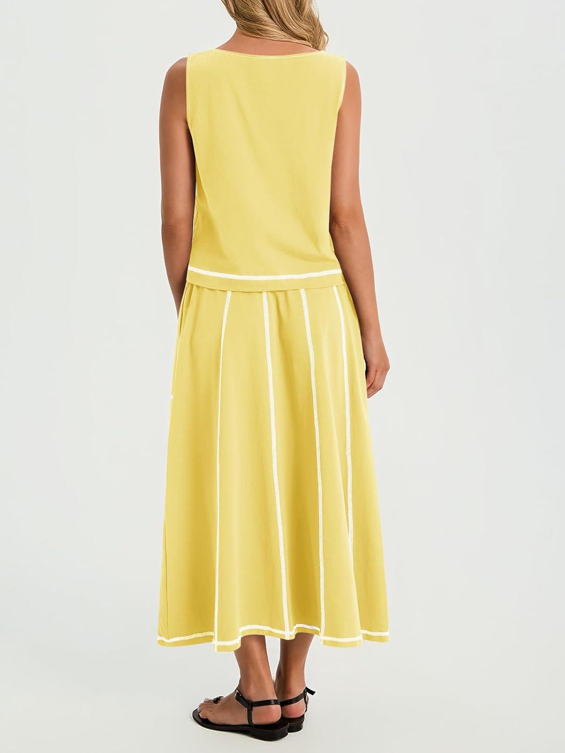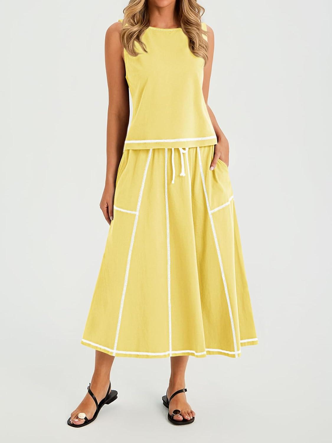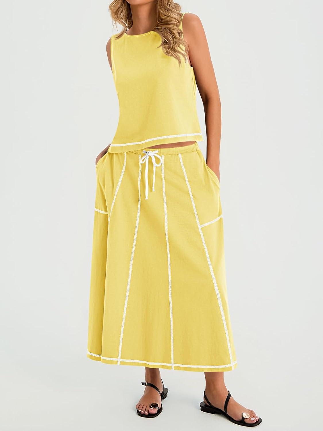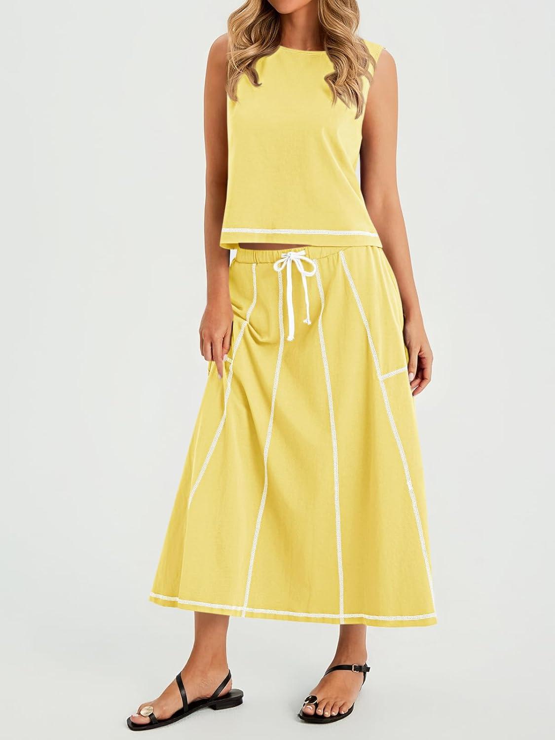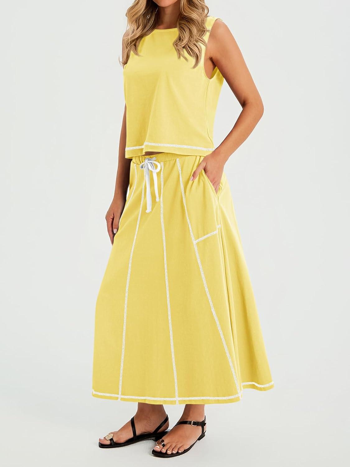 Cicy Bell Womens 2 Piece Outfits Cropped Sleeveless Tank Tops Lounge Sets High Waisted Drawstring Maxi Skirt Matching Sets(Yellow)