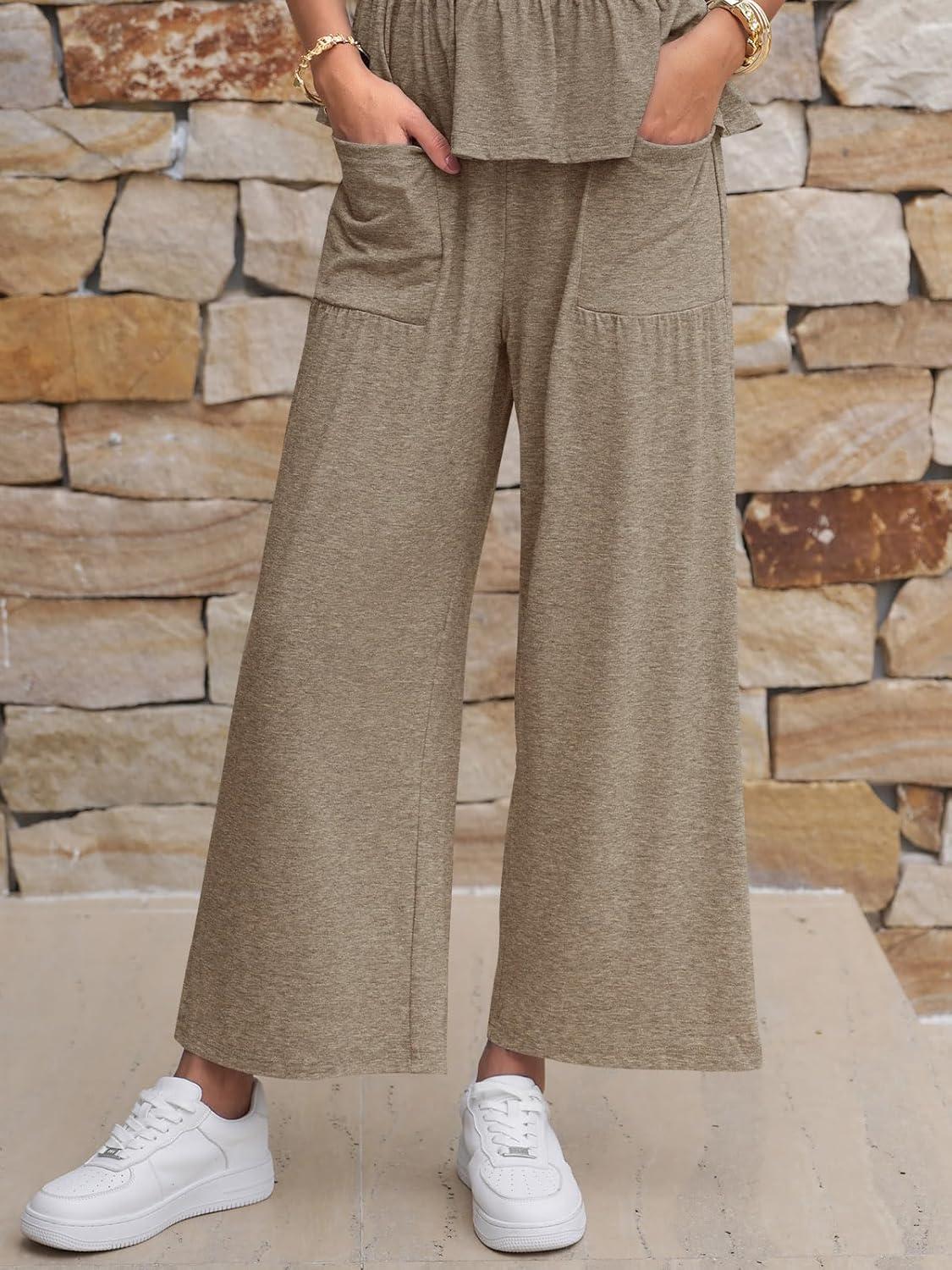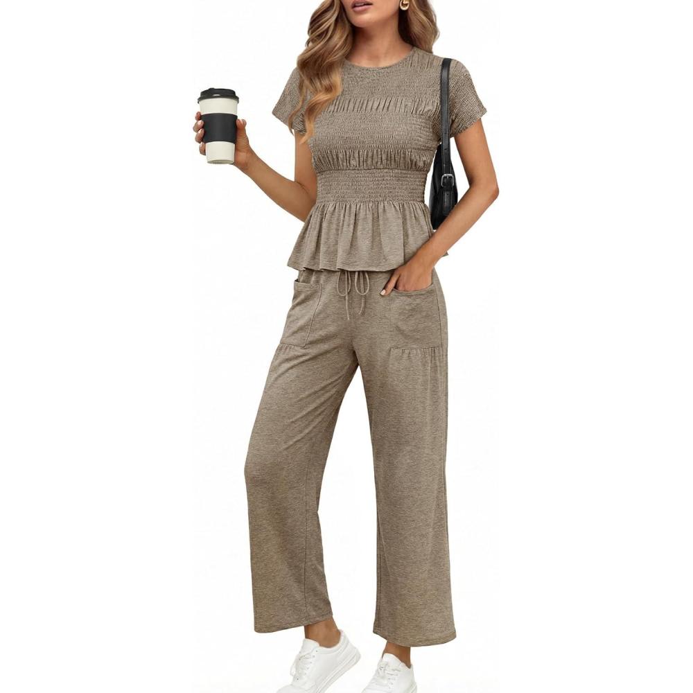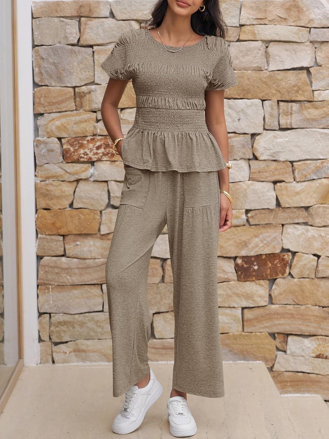 Cicy Bell Womens 2 Piece Outfits Smocked Short Sleeve Tops Wide Leg Elastic Waist Pants Casual Boho Lounge Matching Sets(Khaki)