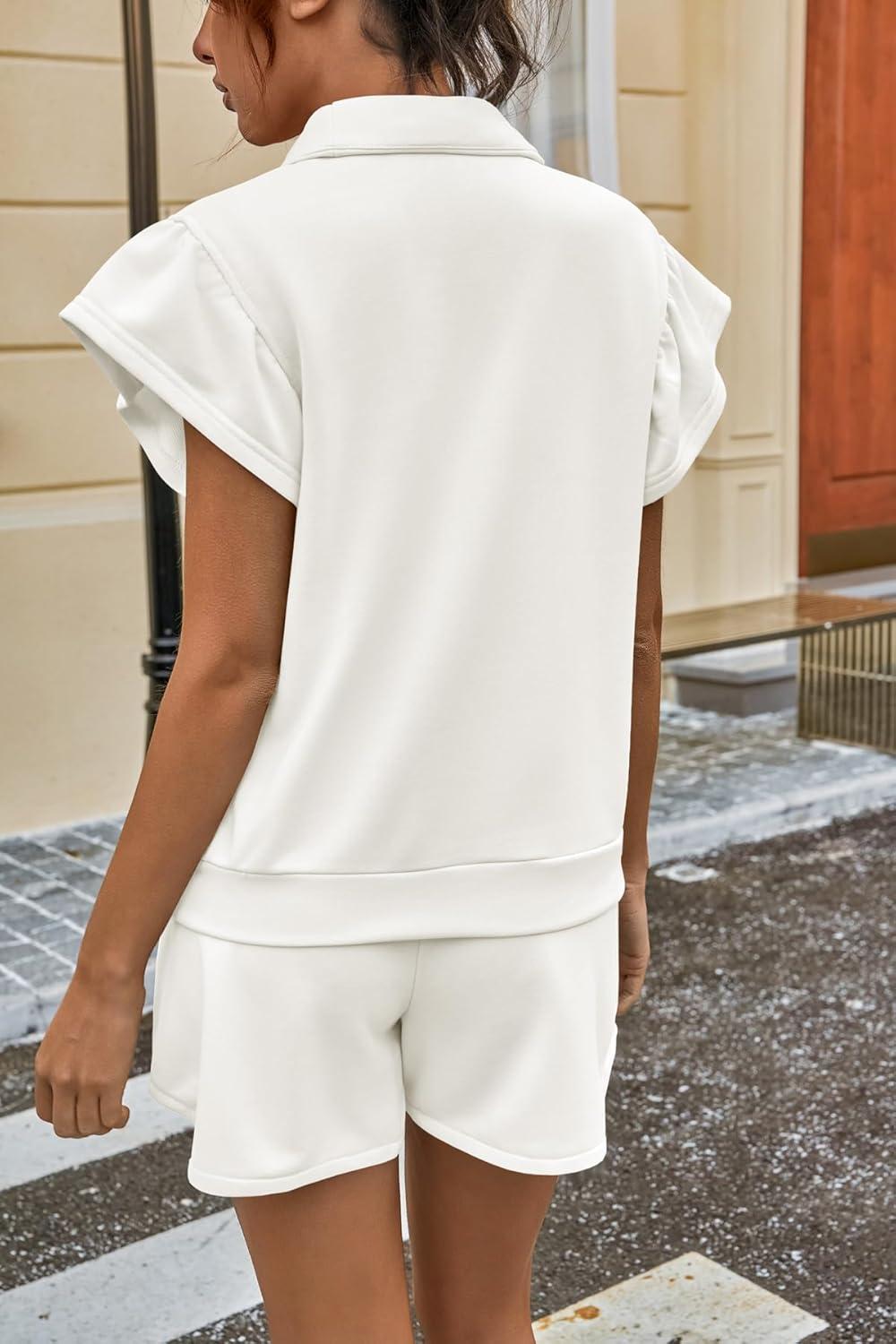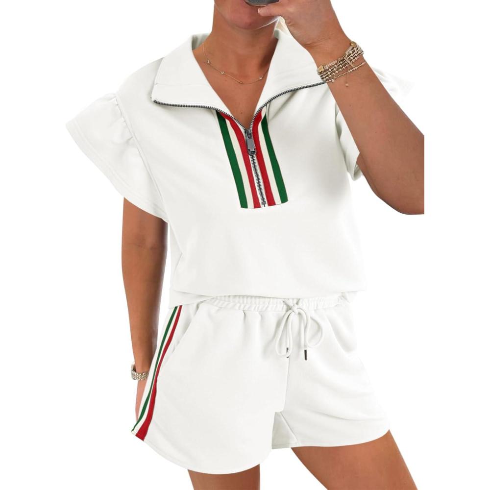 Cicy Bell Womens 2 Piece Outfits Summer Color Block Tracksuits Quarter Zip Cap Sleeve Tops Elastic Waist Shorts Lounge Sets(White)