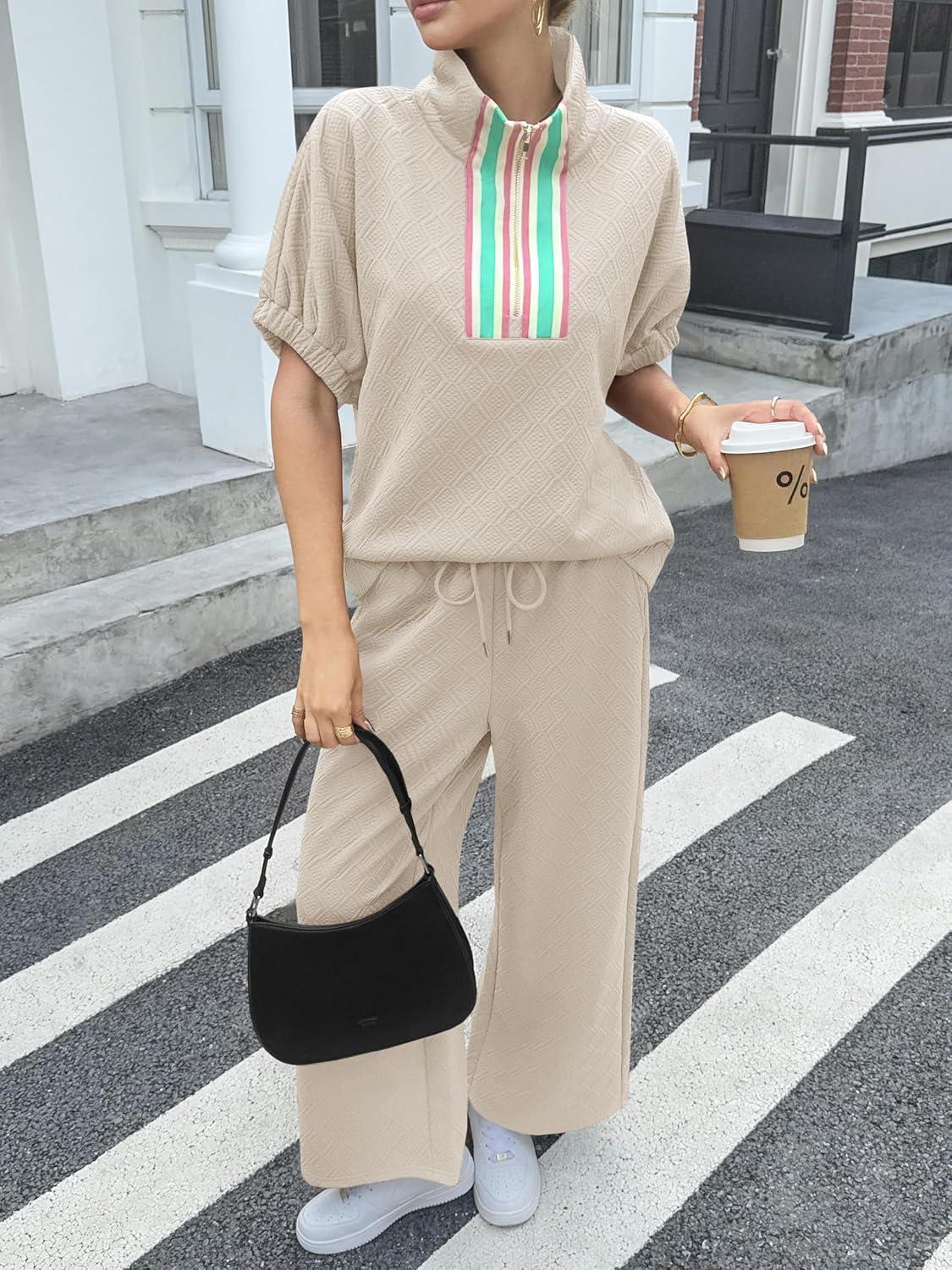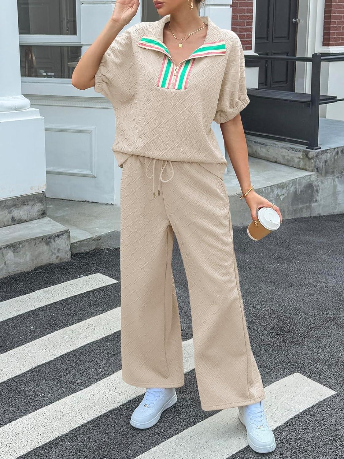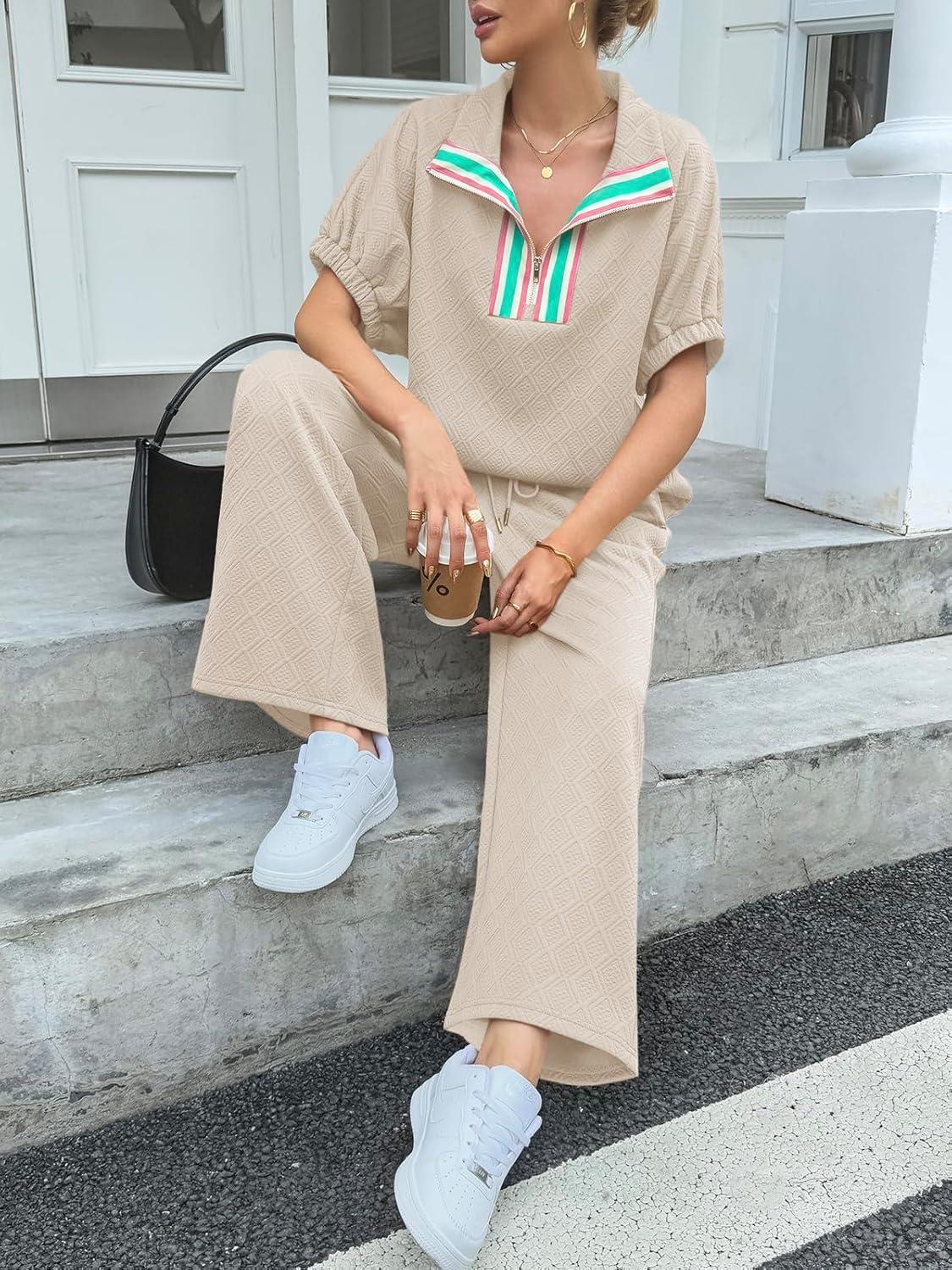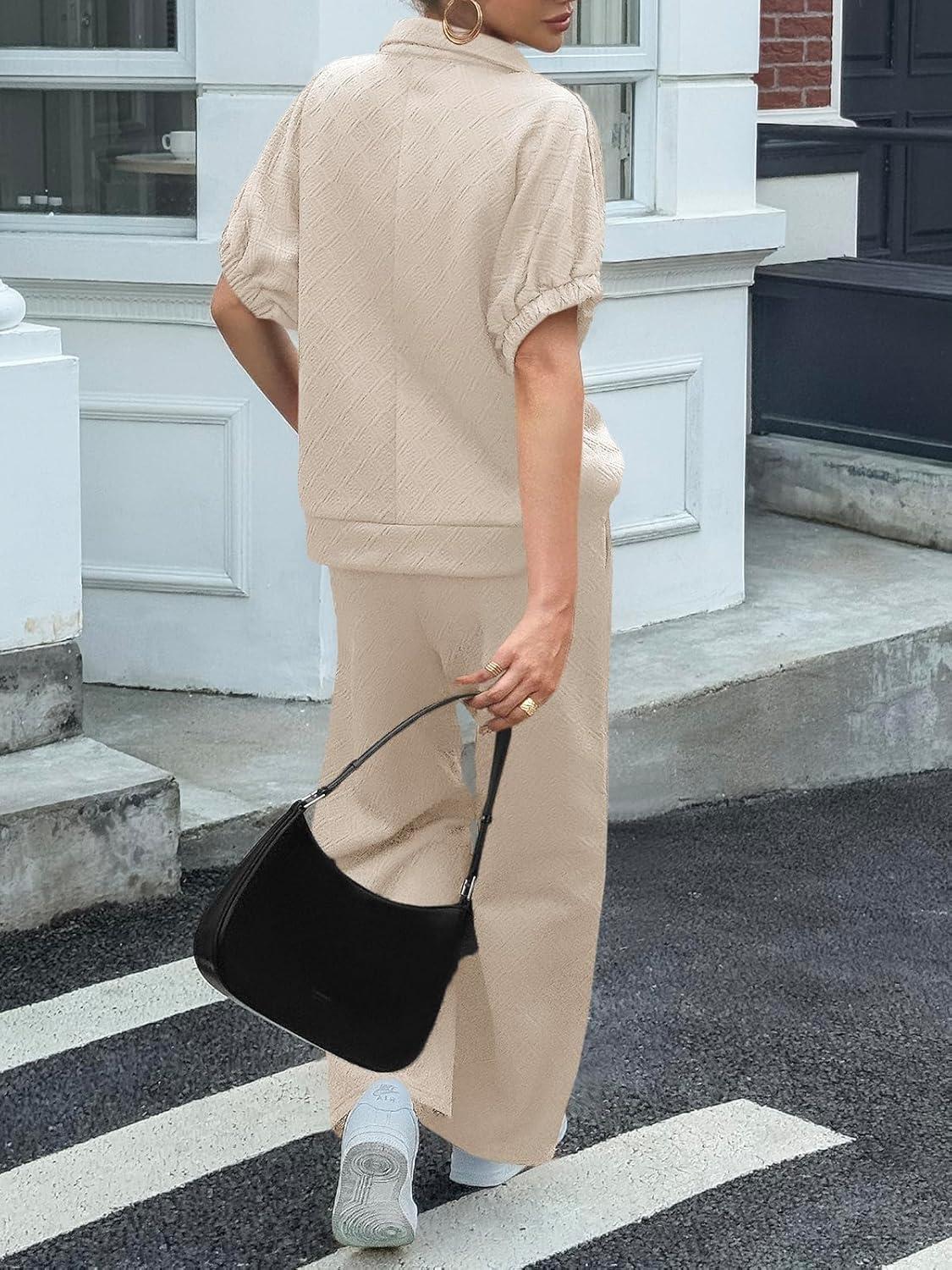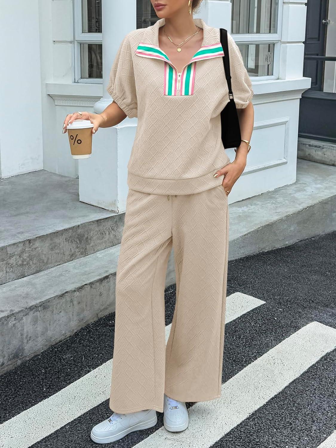 Cicy Bell Womens 2 Piece Outfits Textured Color Block Half Zipper Puff Short Sleeve Tops Cropped Wide Leg Pant Lounge Sets(Light Khaki)