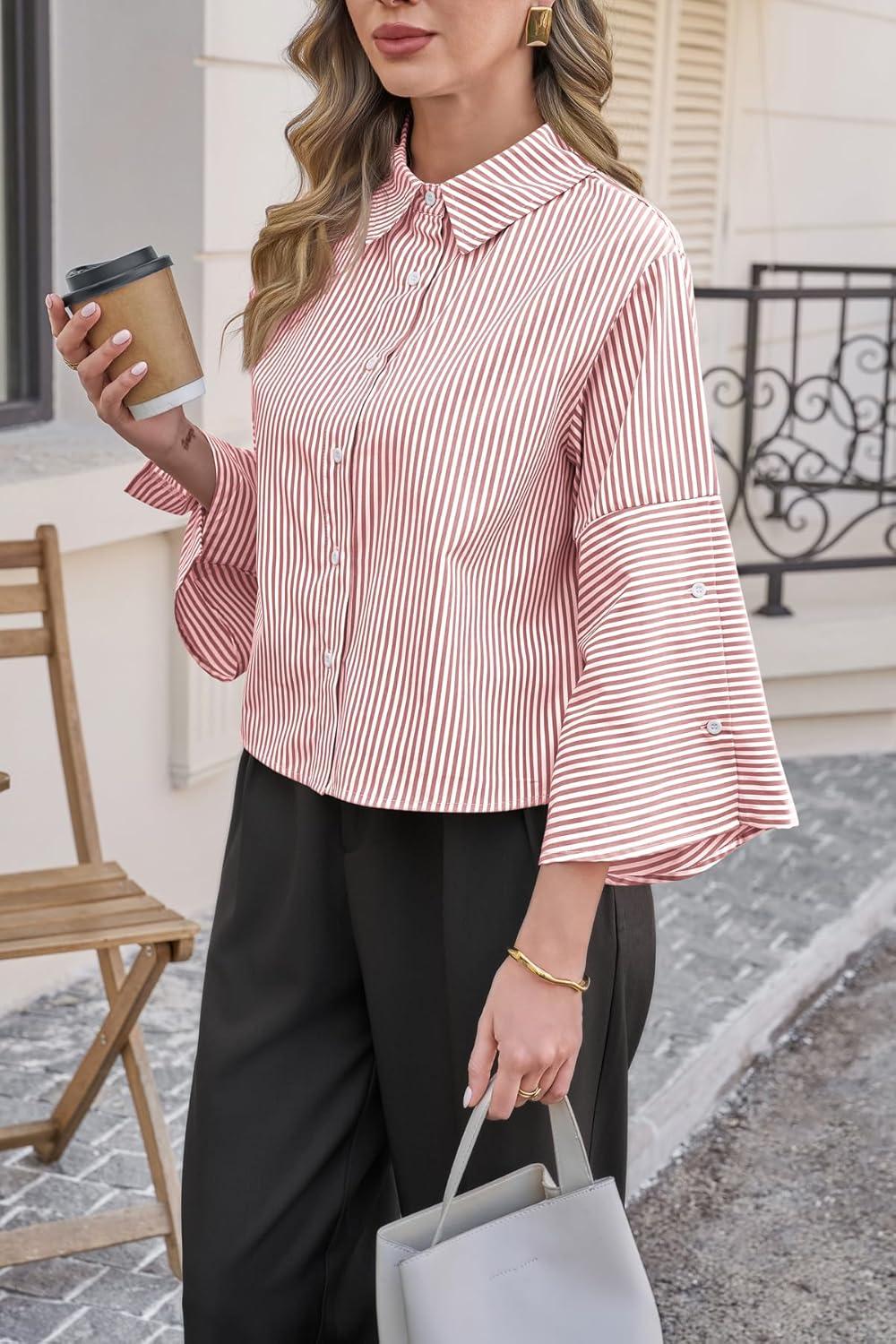 Cicy Bell Womens 3/4 Bell Sleeve Button Down Shirts V Neck Trendy Casual Blouses Loose Fit Work Cotton Tops(Bean Paste)