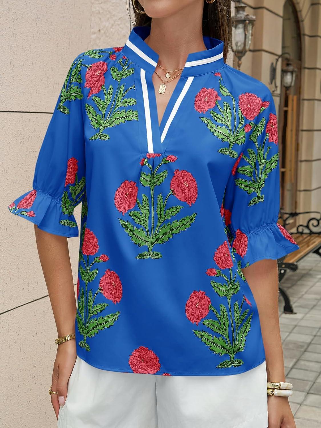 Cicy Bell Womens Boho Floral Blouses Puff Ruffle Sleeve V Neck Summer Shirts Dressy Casual Flowy Blouse Tops(Blue)