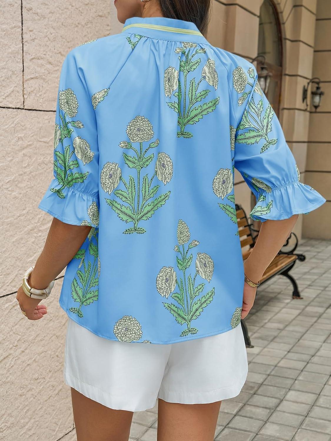 Cicy Bell Womens Boho Floral Blouses Puff Ruffle Sleeve V Neck Summer Shirts Dressy Casual Flowy Blouse Tops(Baby Blue)