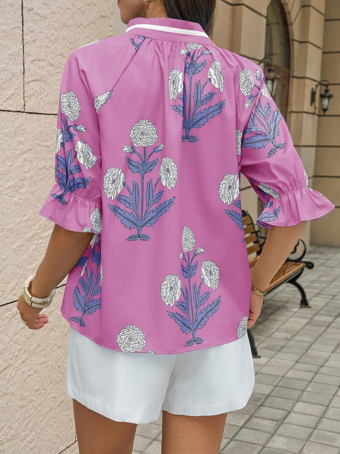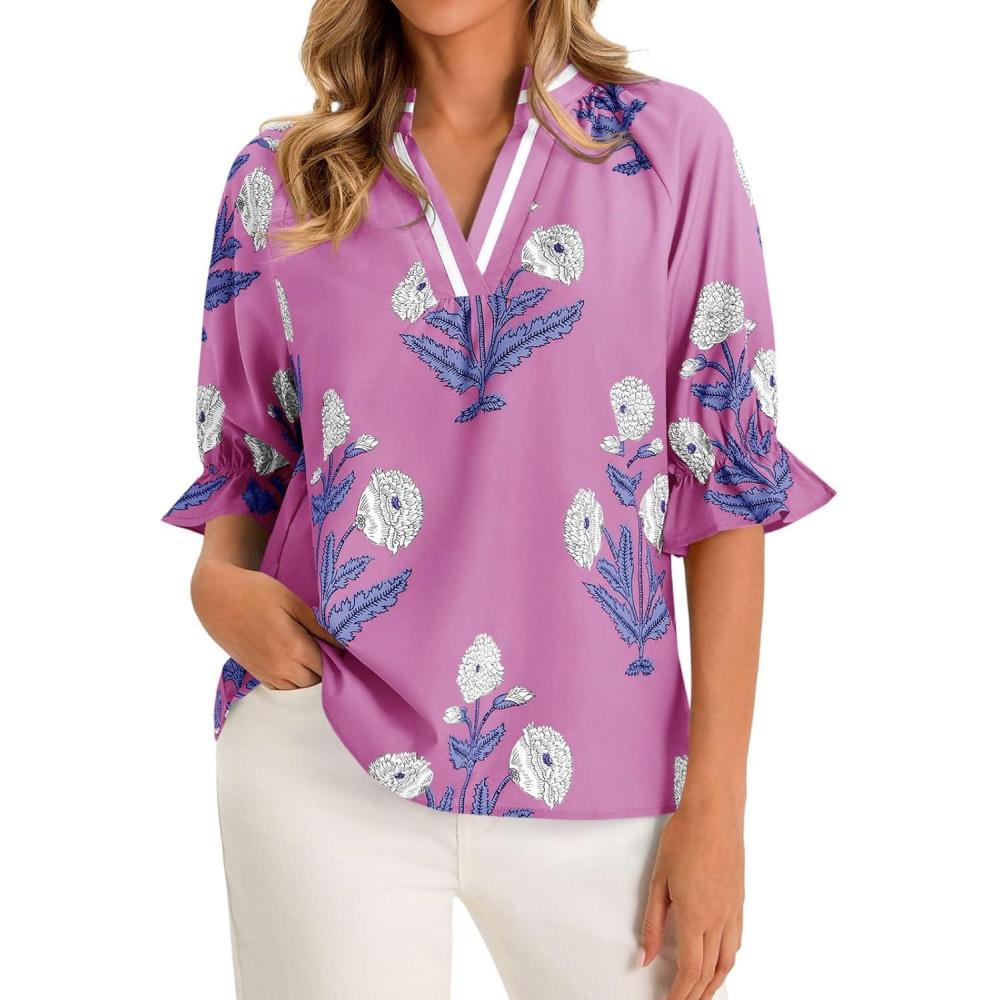 Cicy Bell Womens Boho Floral Blouses Puff Ruffle Sleeve V Neck Summer Shirts Dressy Casual Flowy Blouse Tops(Pink)