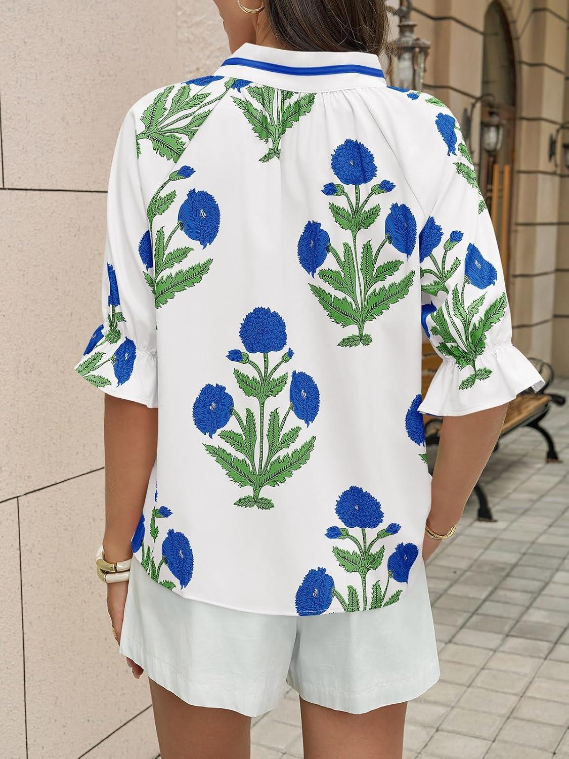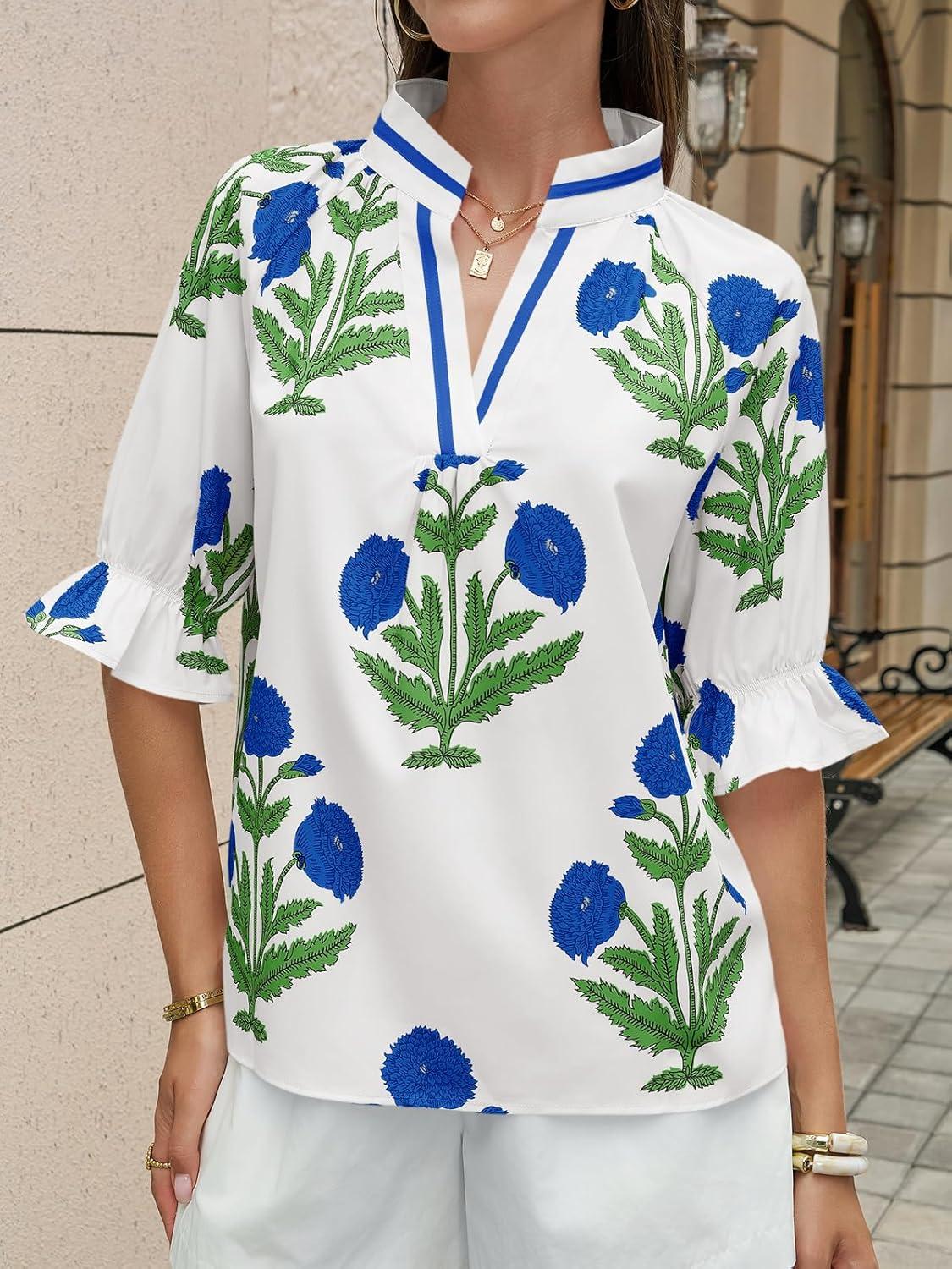 Cicy Bell Womens Boho Floral Blouses Puff Ruffle Sleeve V Neck Summer Shirts Dressy Casual Flowy Blouse Tops(White)