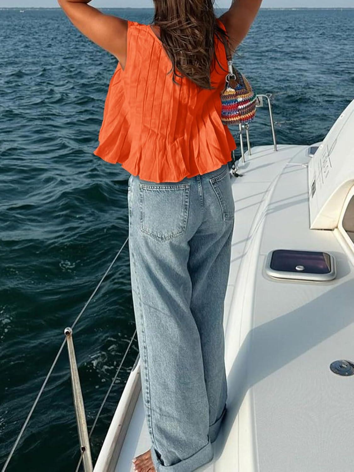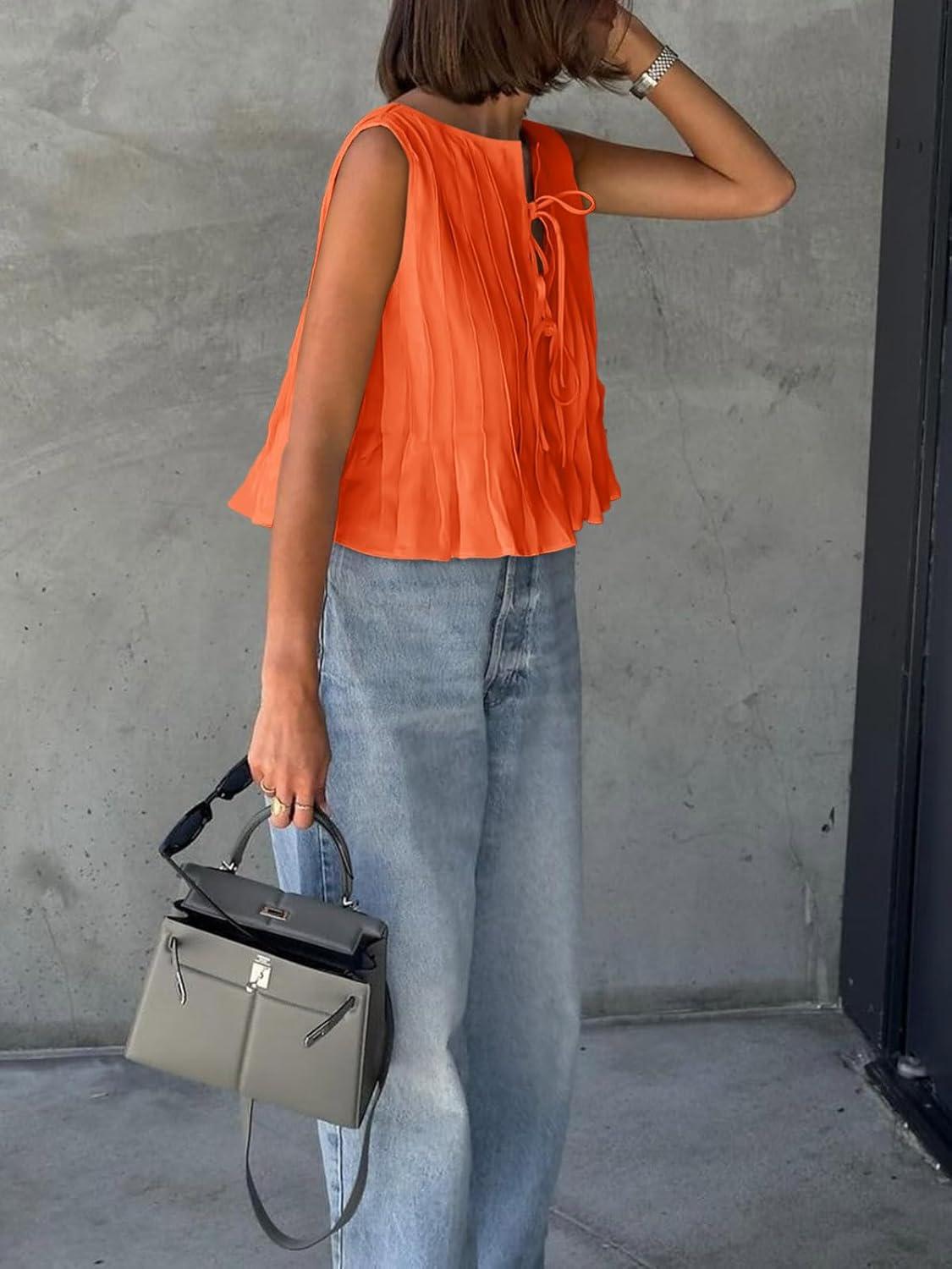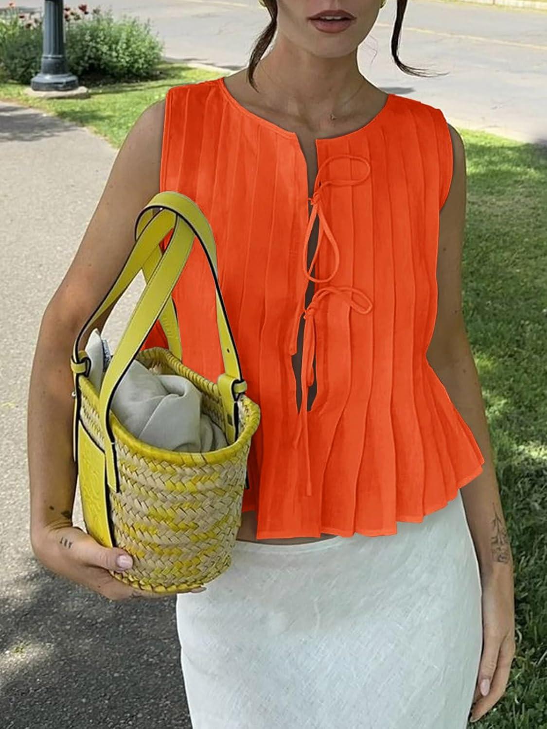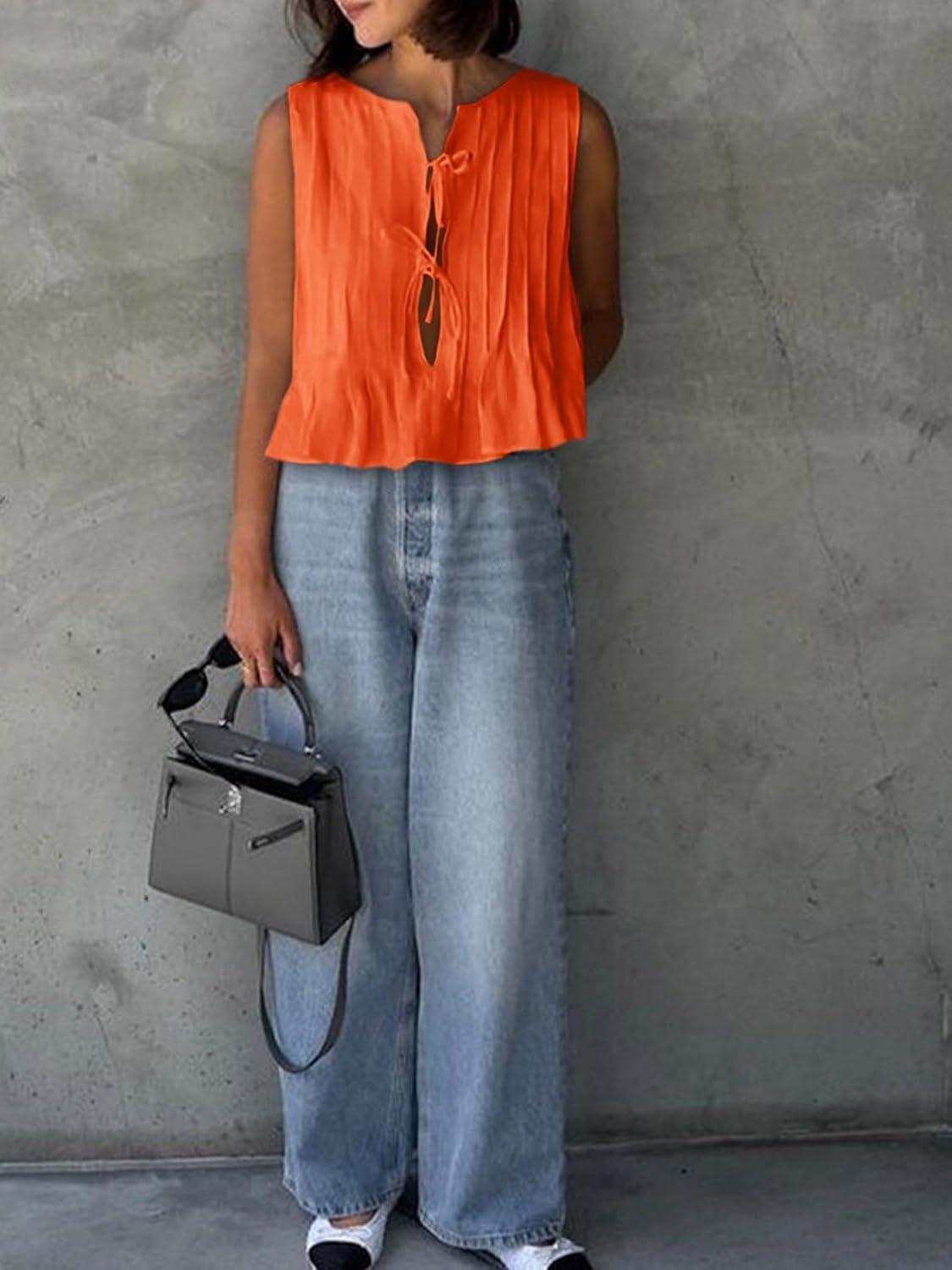 Cicy Bell Womens Bow Front Tie Tank Tops Pleated Babydoll Top Sleeveless Cute Coquette Shirt Summer Outfits(Orange)
