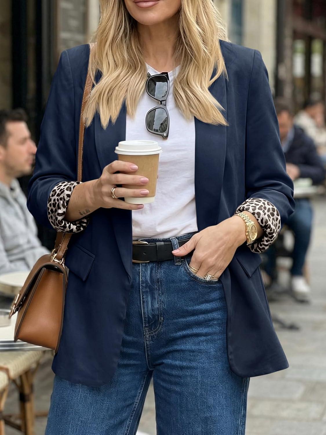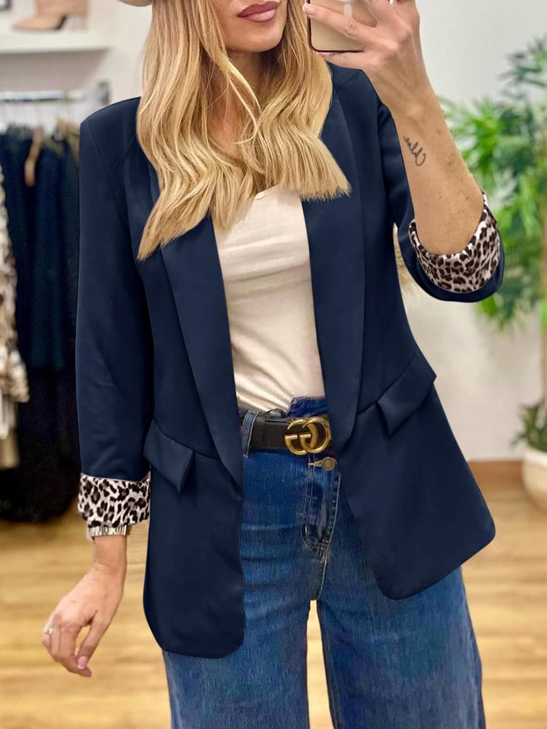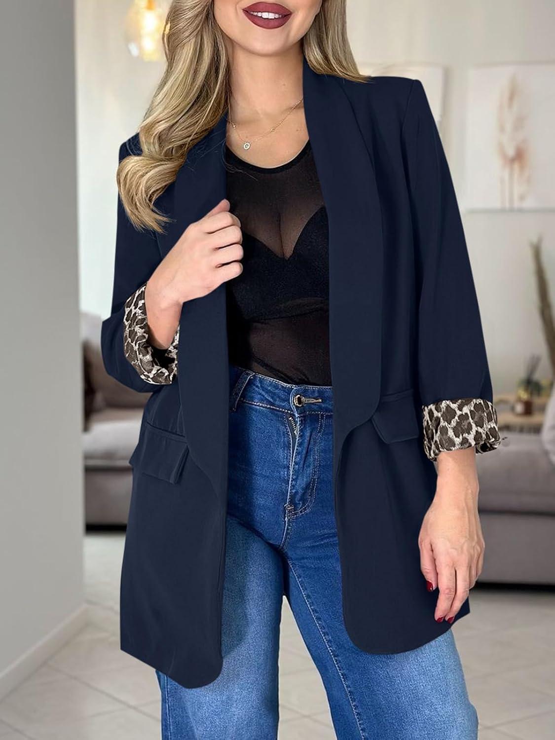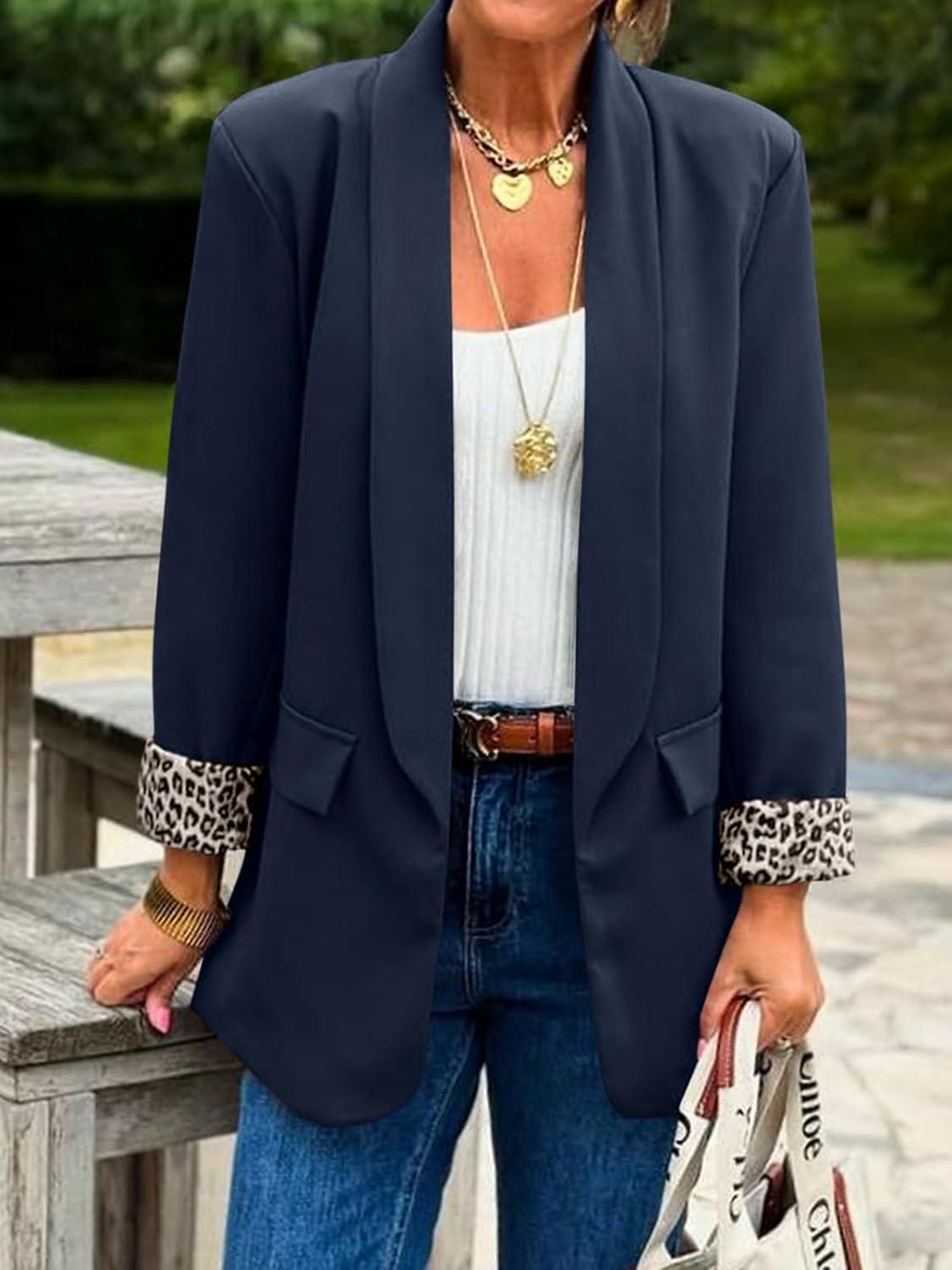 Cicy Bell Womens Business Casual Blazer Shawl Collar Work Long Sleeve Leopard Open Front Oversized Suit Jacket(Navy)