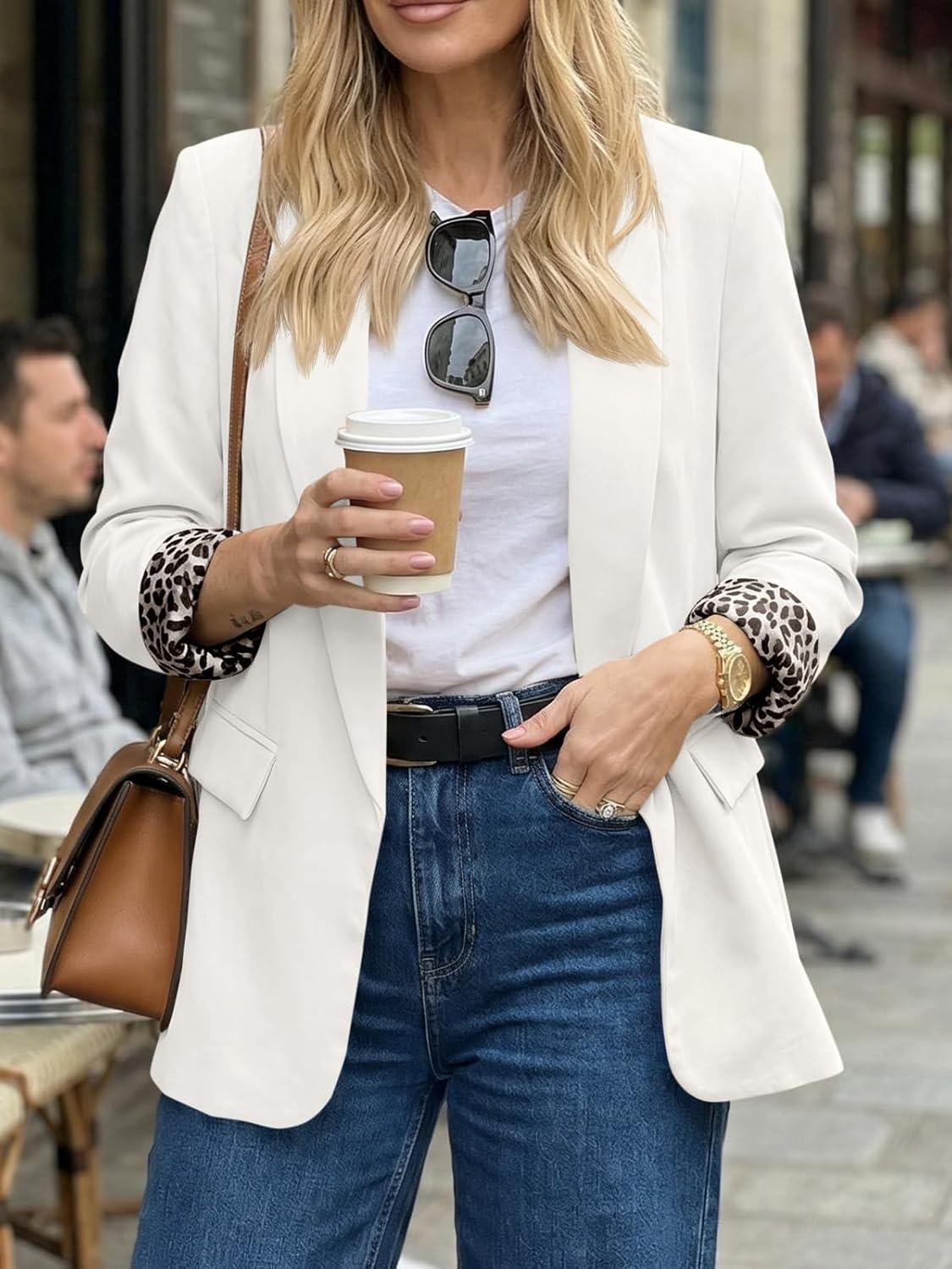 Cicy Bell Womens Business Casual Blazer Shawl Collar Work Long Sleeve Leopard Open Front Oversized Suit Jacket(White)