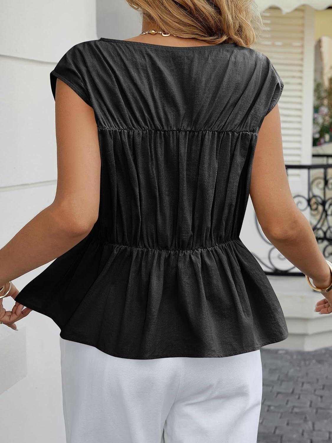 Cicy Bell Womens Cap Sleeve Peplum Tank Tops Summer Babydoll Smocked Cotton Shirts Casual Crew Neck Pleated Blouse(Black)