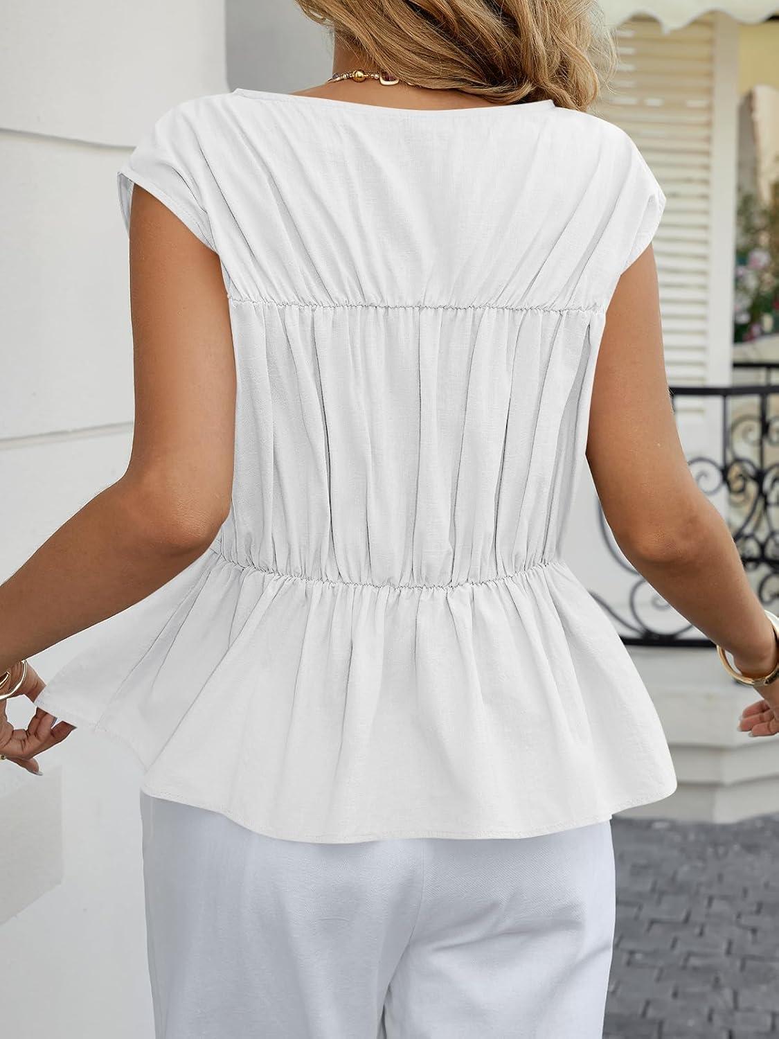 Cicy Bell Womens Cap Sleeve Peplum Tank Tops Summer Babydoll Smocked Cotton Shirts Casual Crew Neck Pleated Blouse(White)