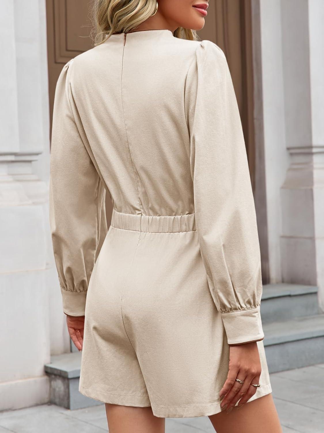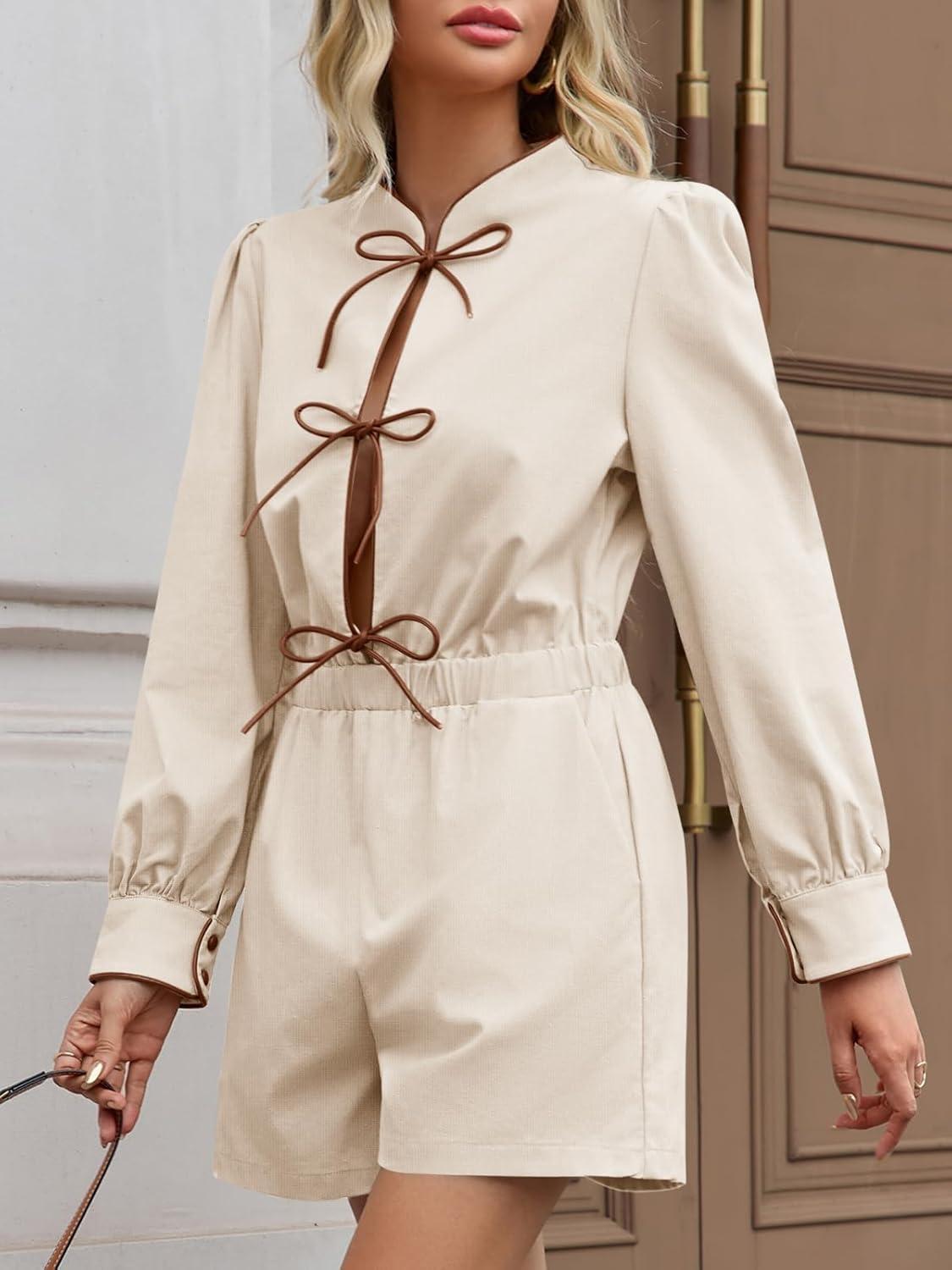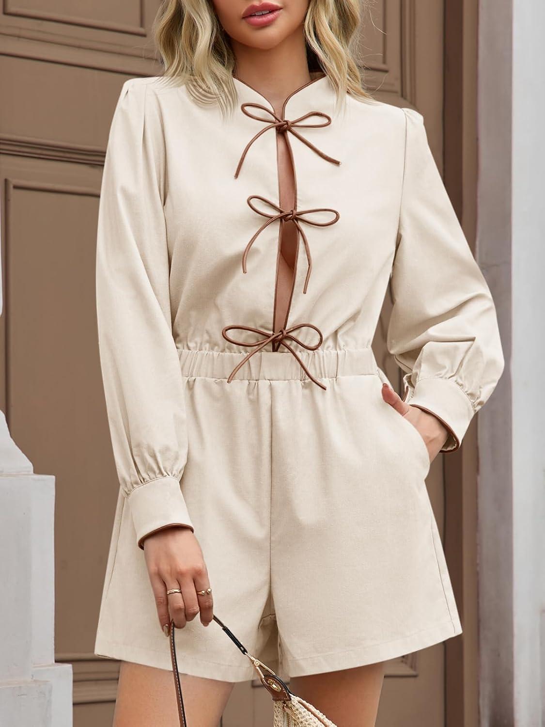 Cicy Bell Womens Casual Short Rompers Cute Tie Front Long Lantern Sleeve Shorts Jumpsuits with Pockets 2025 Fall Outfits(Beige)