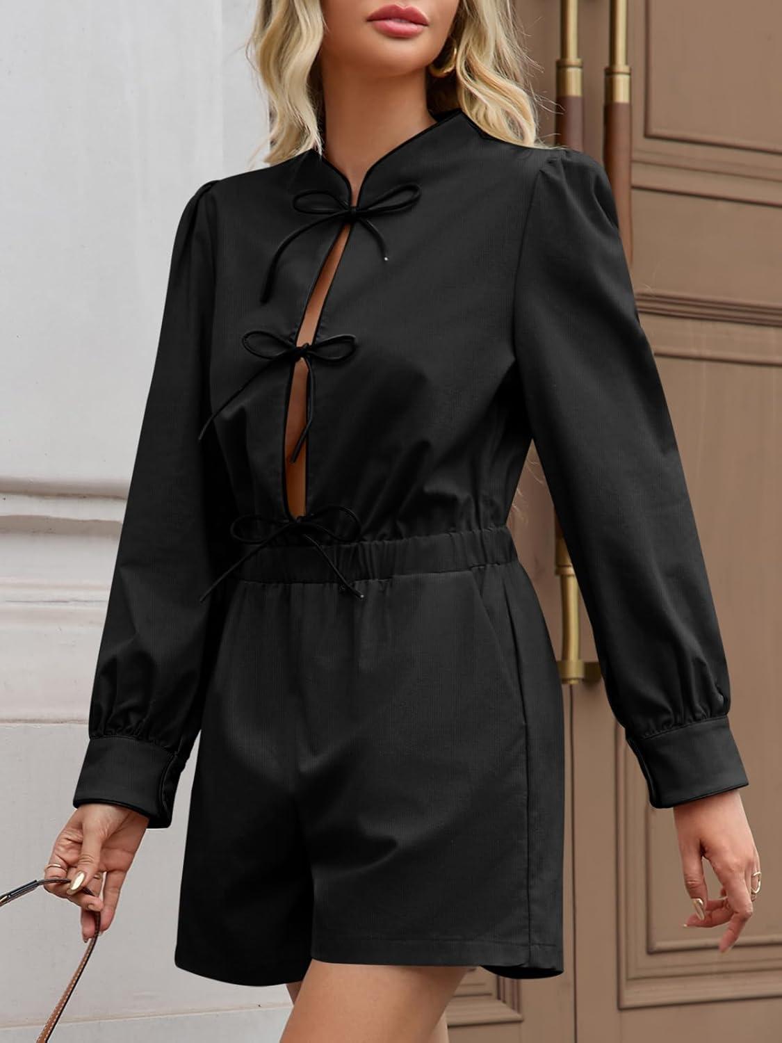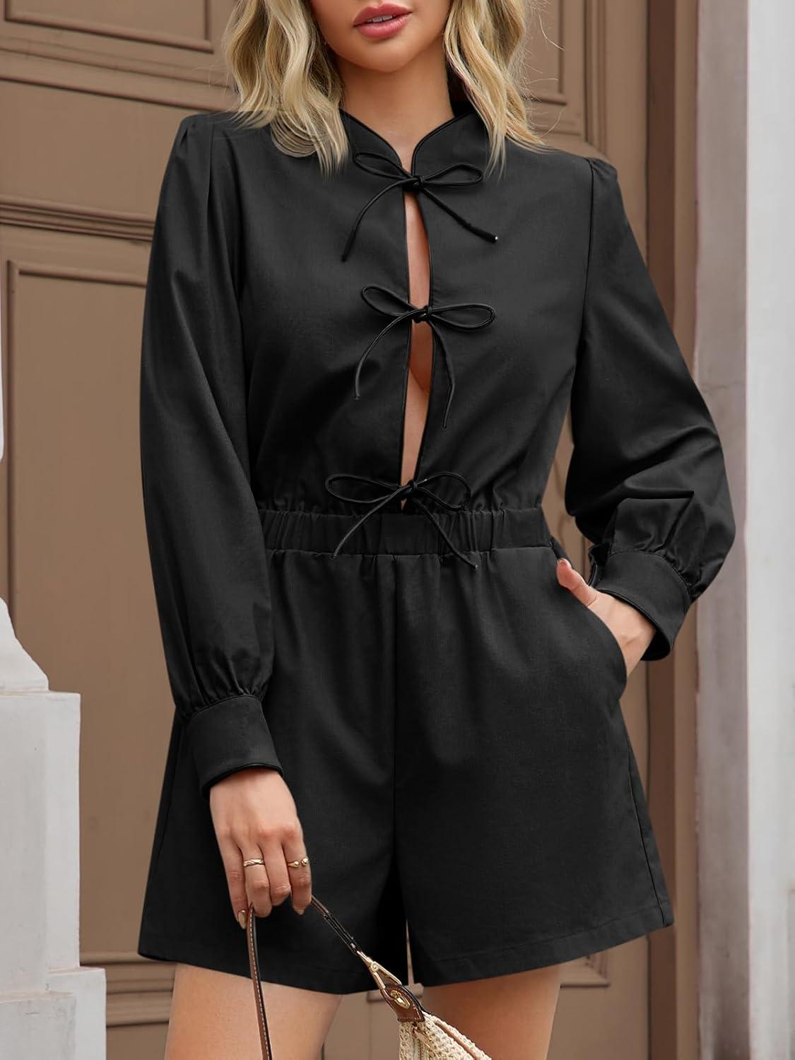 Cicy Bell Womens Casual Short Rompers Cute Tie Front Long Lantern Sleeve Shorts Jumpsuits with Pockets 2025 Fall Outfits(Black)
