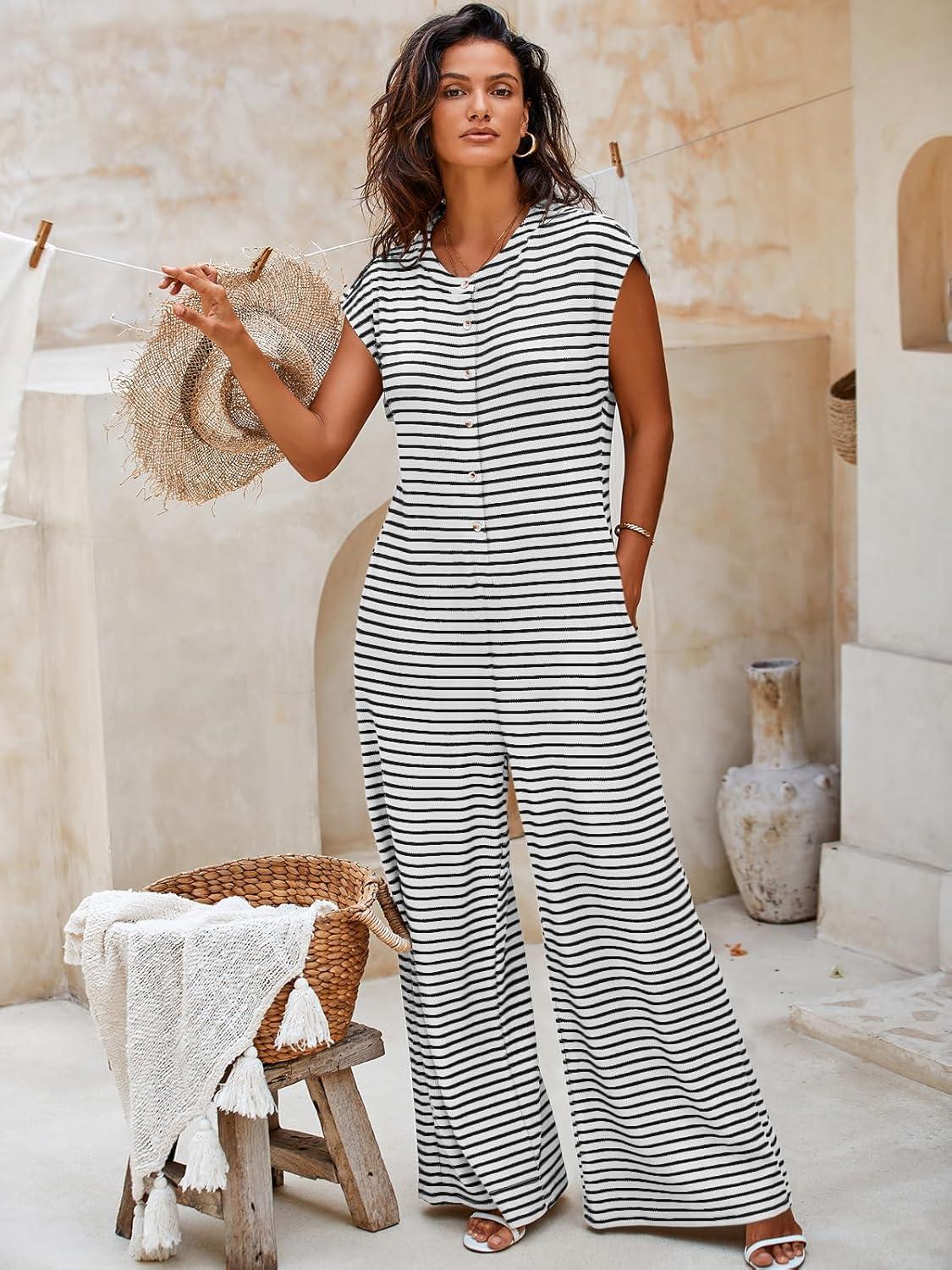 imageCicy Bell Womens Casual Striped Jumpsuits Wide Leg Cap Sleeve Summer Jumper Crew Neck Button Down Waffle Knit OutfitsWhite