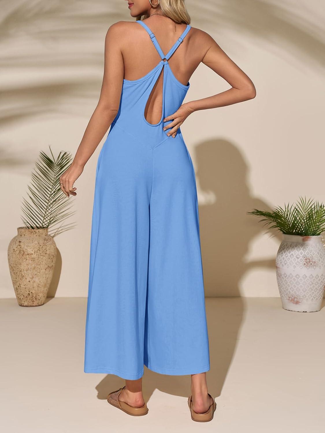 Cicy Bell Womens Casual Wide Leg Jumpsuits Summer Spaghetti Strap Sleeveless Cut Out Loose Long Pant Rompers with Pockets(Blue)