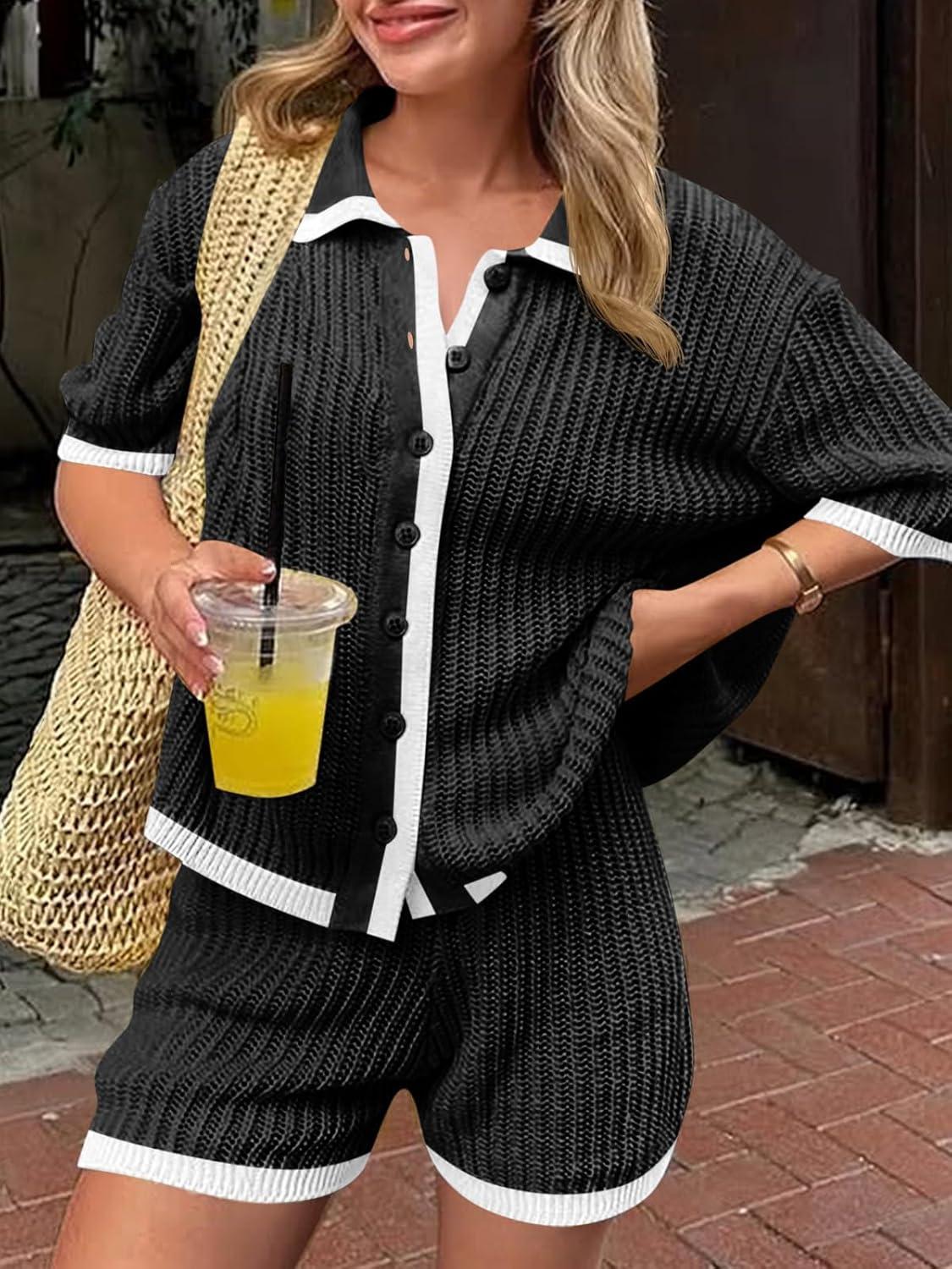 Cicy Bell Womens Color Block 2 Piece Outfits Summer Sweater Set Short Sleeve Tops and Shorts Vacation Casual Knit Lounge Sets(Black)