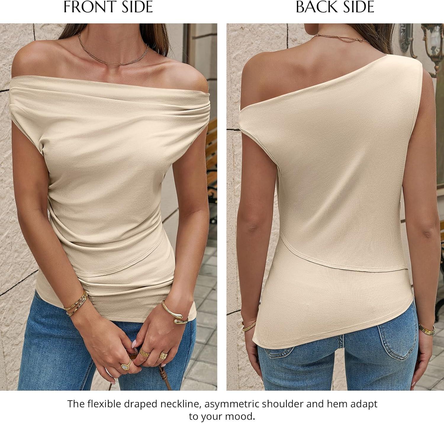 Cicy Bell Womens Cowl Neck Tank Tops 2026 Summer Off The Shoulder Asymmetrical Ruched Tops Going Out Sleeveless Shirts(Apricot)