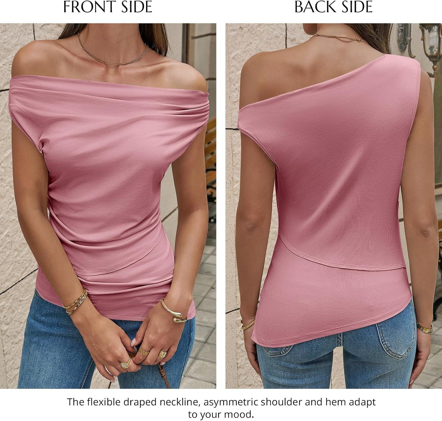 Cicy Bell Womens Cowl Neck Tank Tops 2026 Summer Off The Shoulder Asymmetrical Ruched Tops Going Out Sleeveless Shirts(Pink)