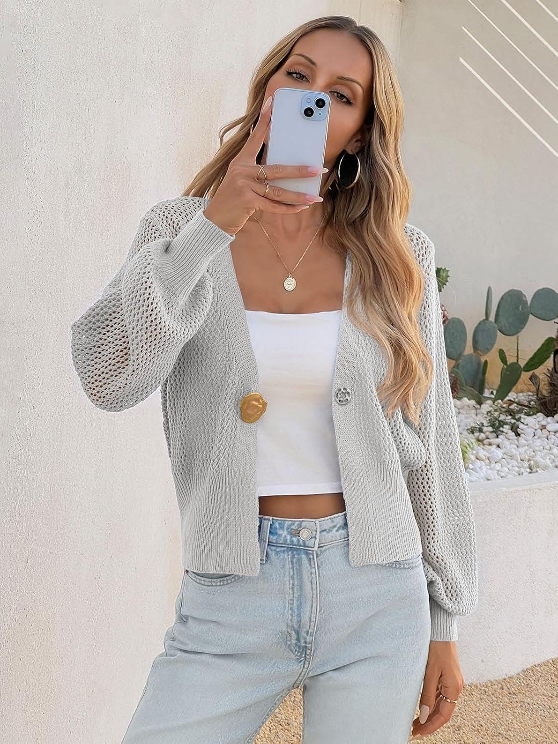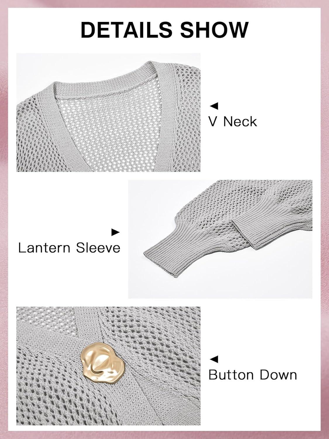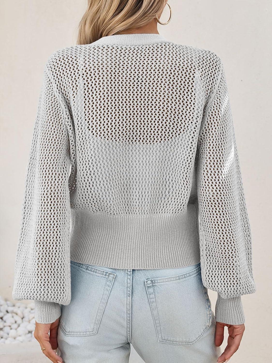 Cicy Bell Womens Cropped Crochet Cardigans Hollow Out Button Down Lantern Sleeve Knit Sweaters Casual Mesh Loose Fit Cover Up(Grey)