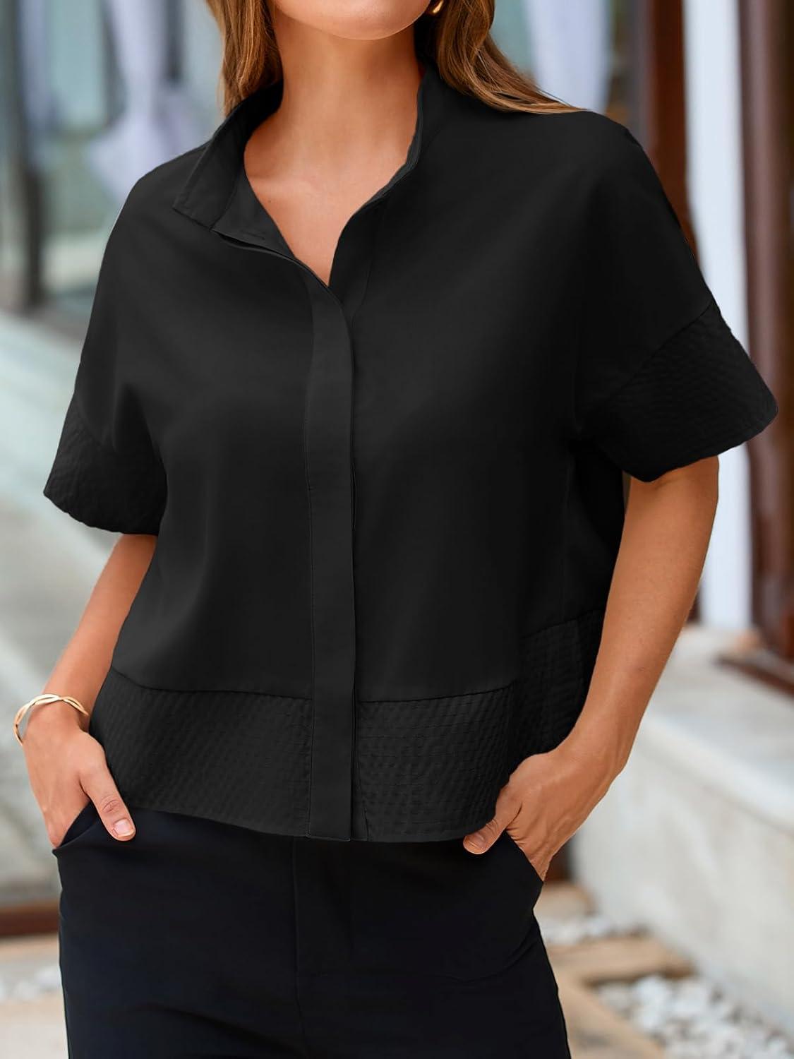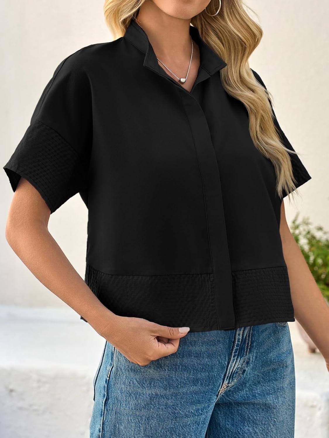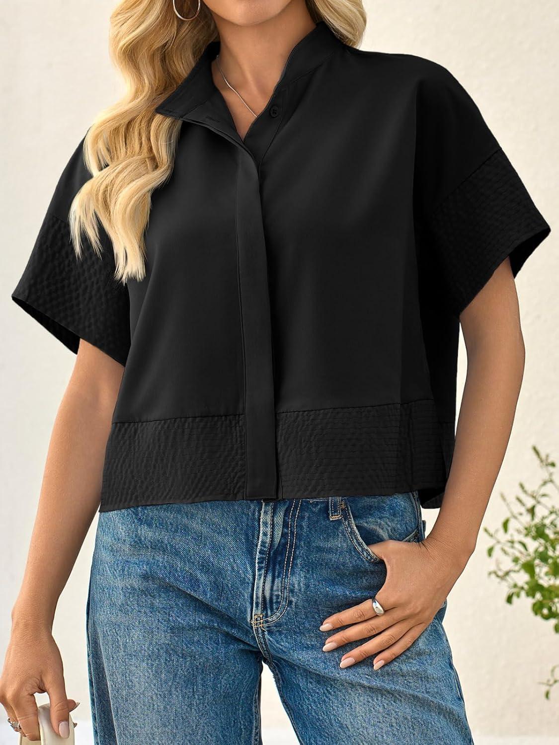 Cicy Bell Womens Cropped Short Sleeve Button Down Shirts Pleated Summer Dressy Casual Blouse Stand Collar Loose Fit Tops(Black)