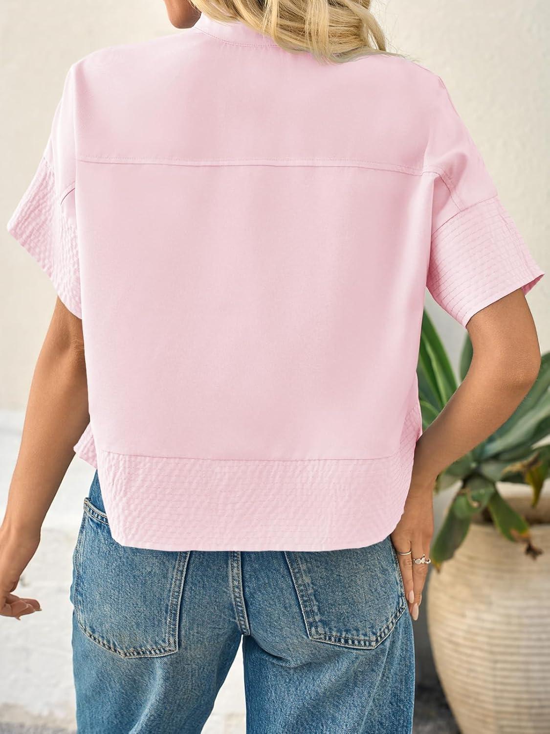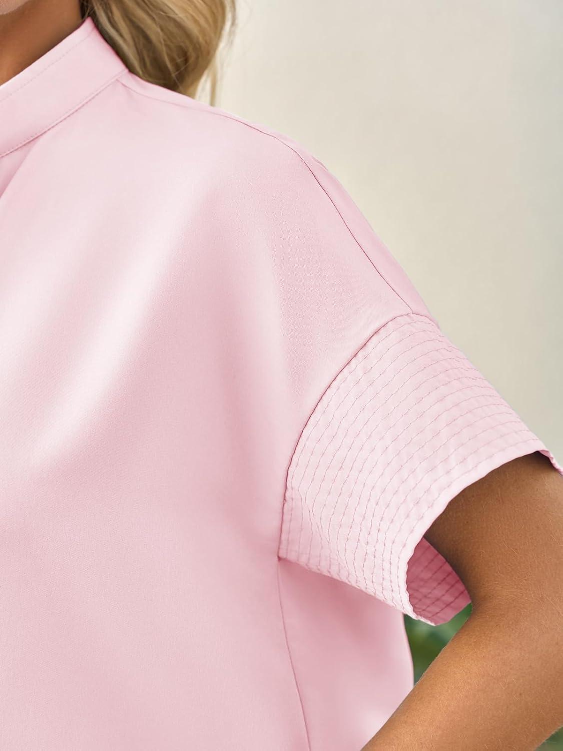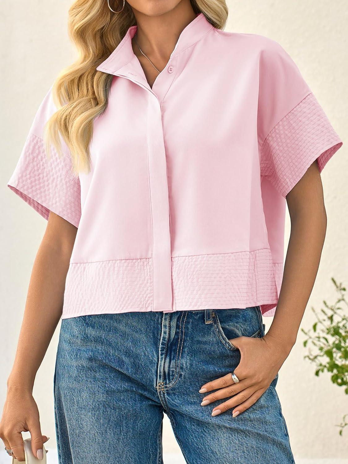 Cicy Bell Womens Cropped Short Sleeve Button Down Shirts Pleated Summer Dressy Casual Blouse Stand Collar Loose Fit Tops(Light Pink)