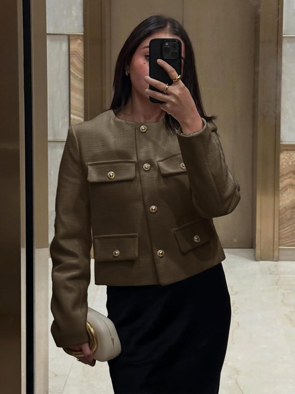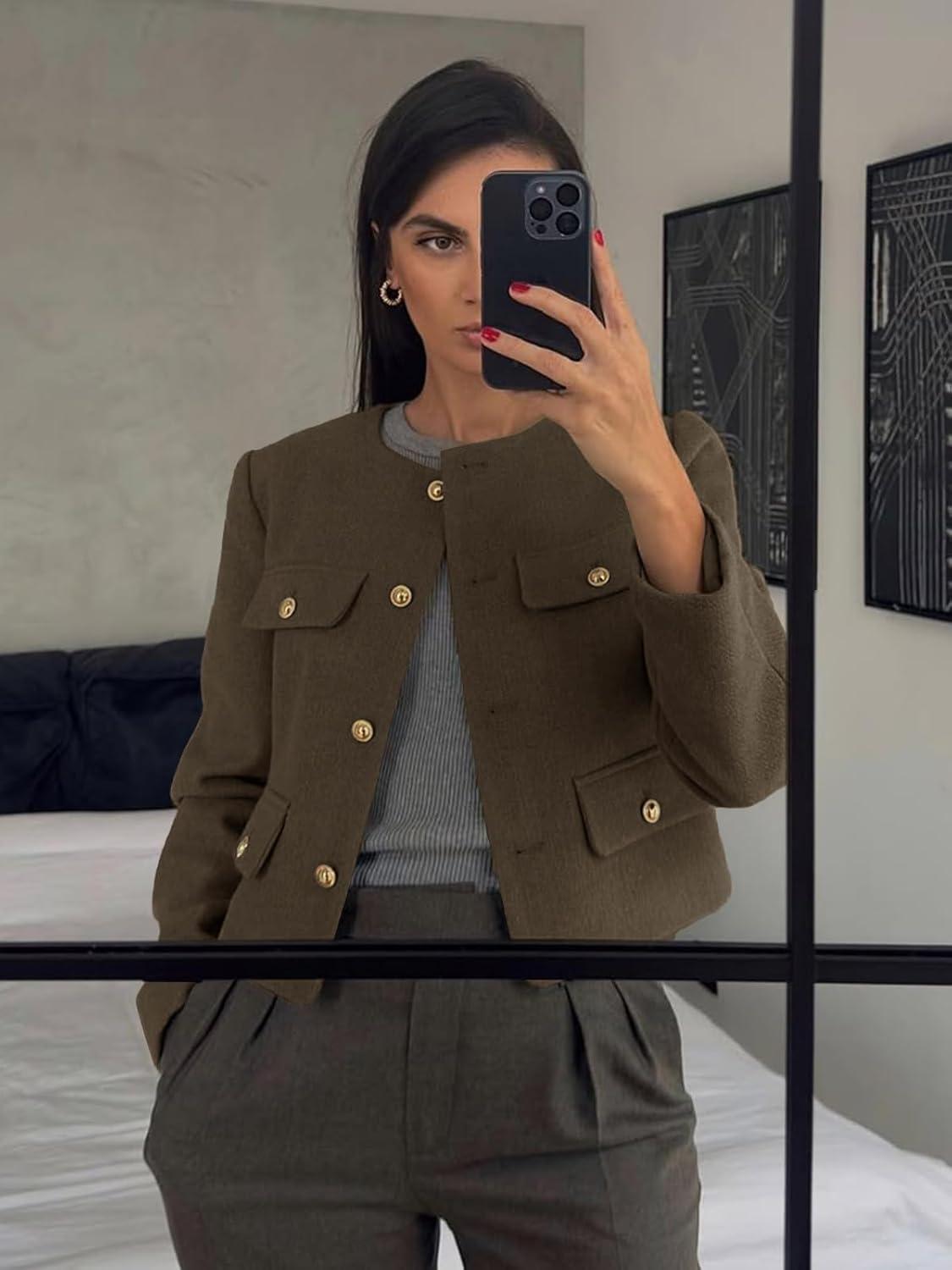 Cicy Bell Womens Cropped Tweed Blazers Jacket Collarless Button Down Business Casual Winter Coats 2026 Spring Outfits(Coffee)