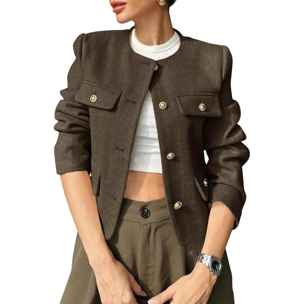 Cicy Bell Womens Cropped Tweed Blazers Jacket Collarless Button Down Business Casual Winter Coats 2026 Spring Outfits(Brown)