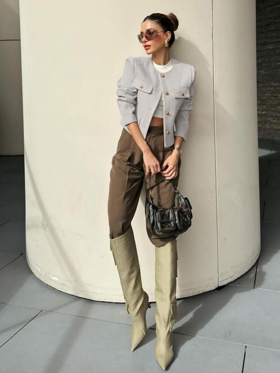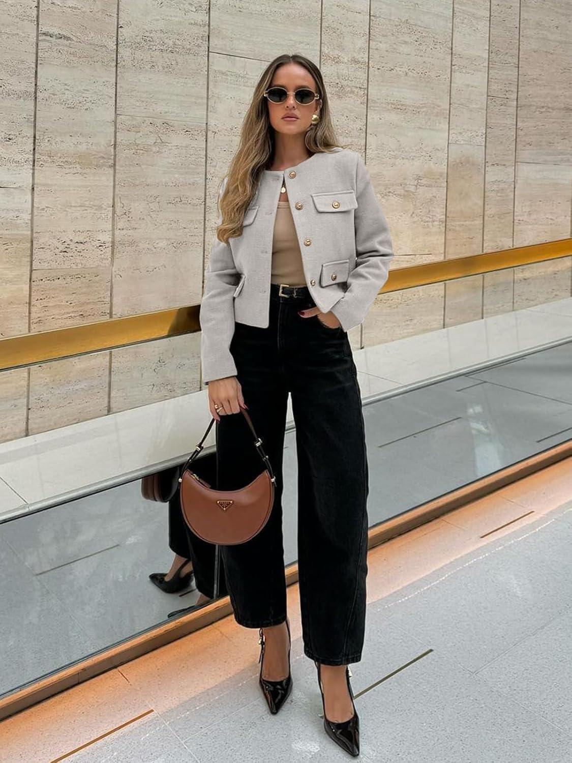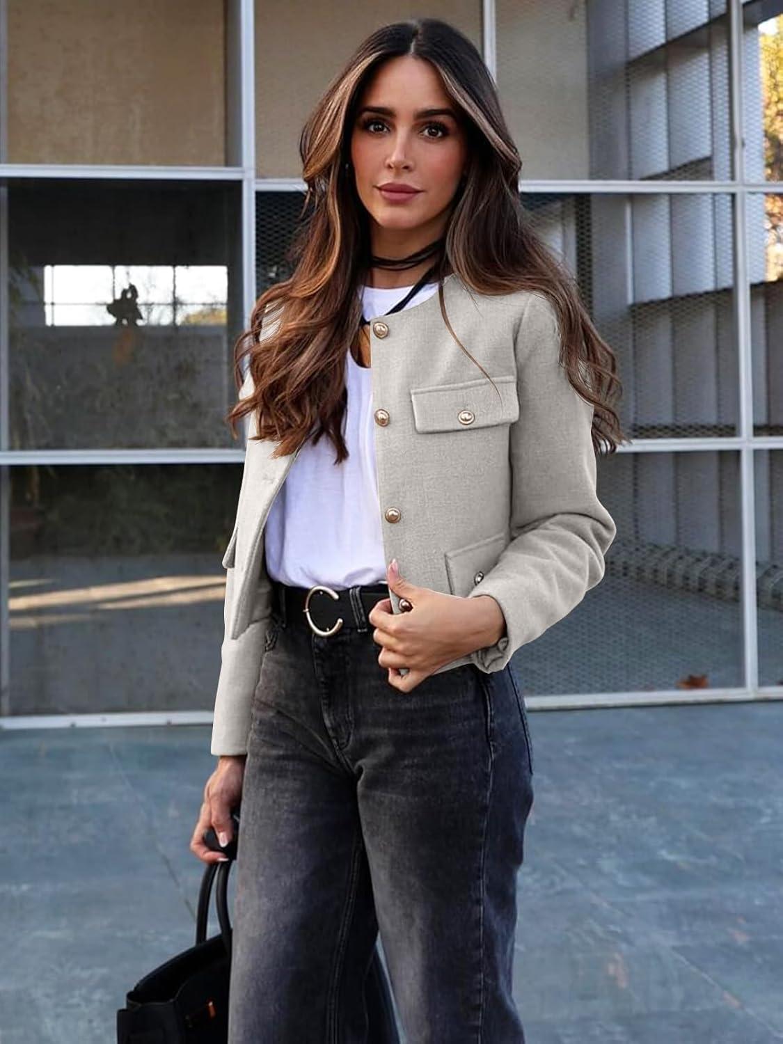 Cicy Bell Womens Cropped Tweed Blazers Jacket Collarless Button Down Business Casual Winter Coats 2026 Spring Outfits(Light Grey)