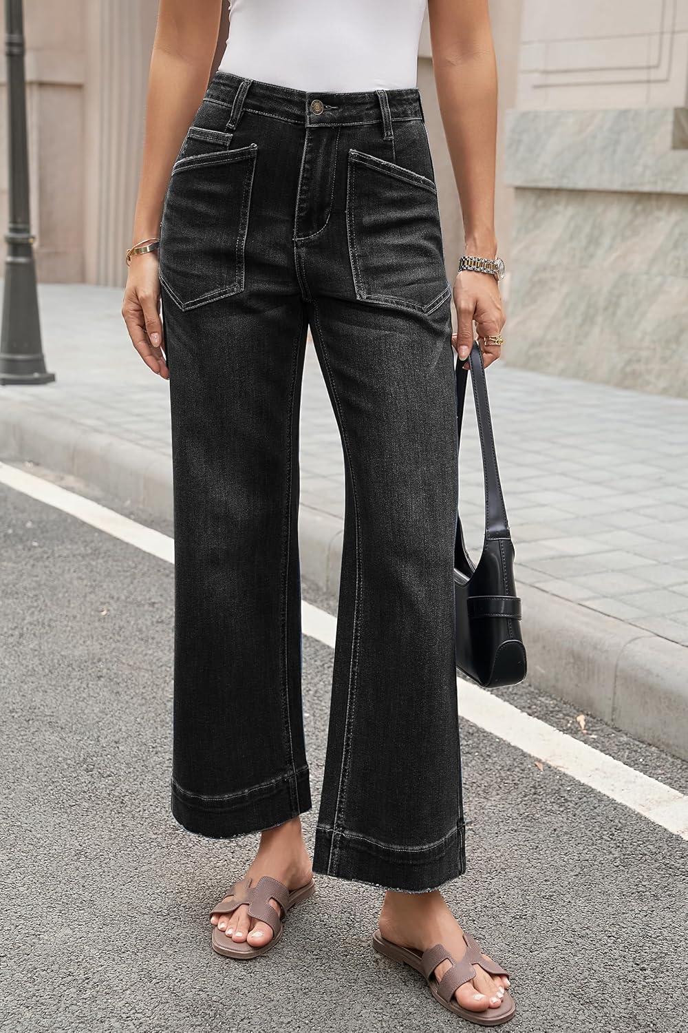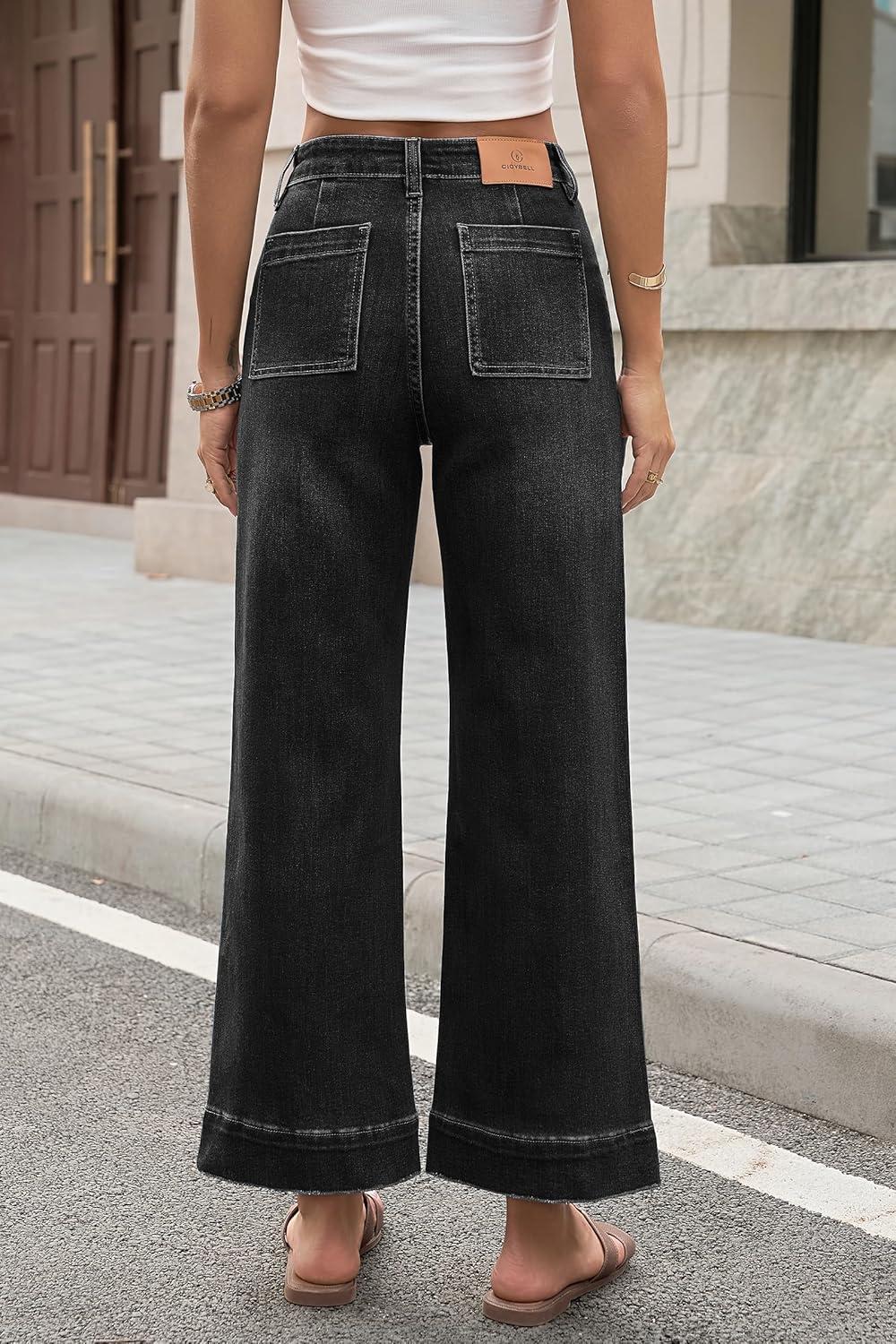 Cicy Bell Womens Cropped Wide Leg Jeans Stretchy High Waisted Trendy Capri Baggy Denim Ankle Pants with Pockets(Black)