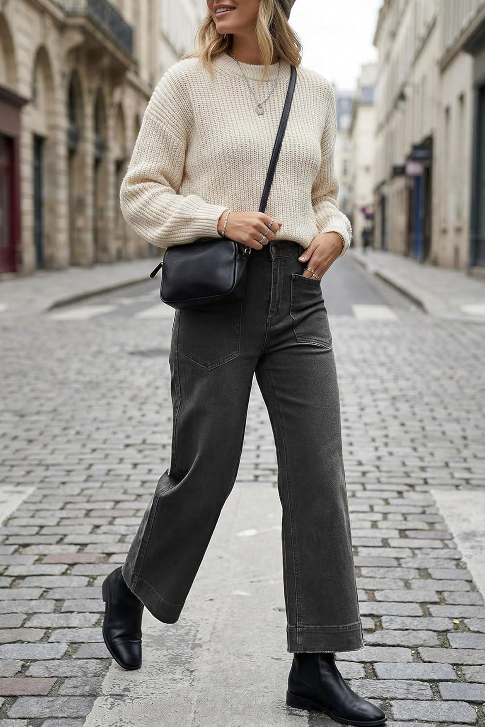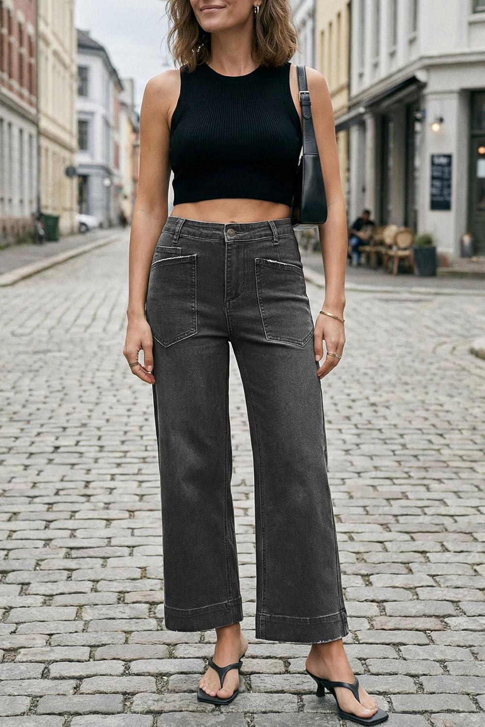 Cicy Bell Womens Cropped Wide Leg Jeans Stretchy High Waisted Trendy Capri Baggy Denim Ankle Pants with Pockets(Grey)