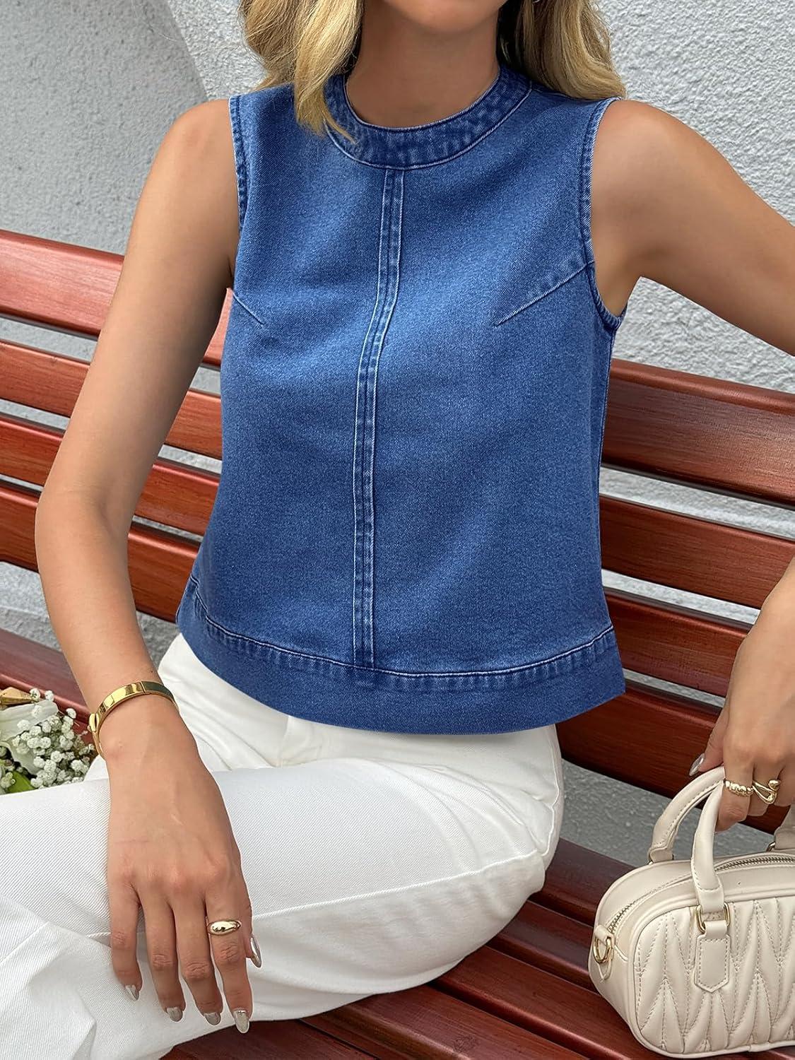 Cicy Bell Womens Denim Tank Tops Crew Neck Summer Casual Sleeveless Shirts Cropped Loose Fit Jean Vests(Blue)