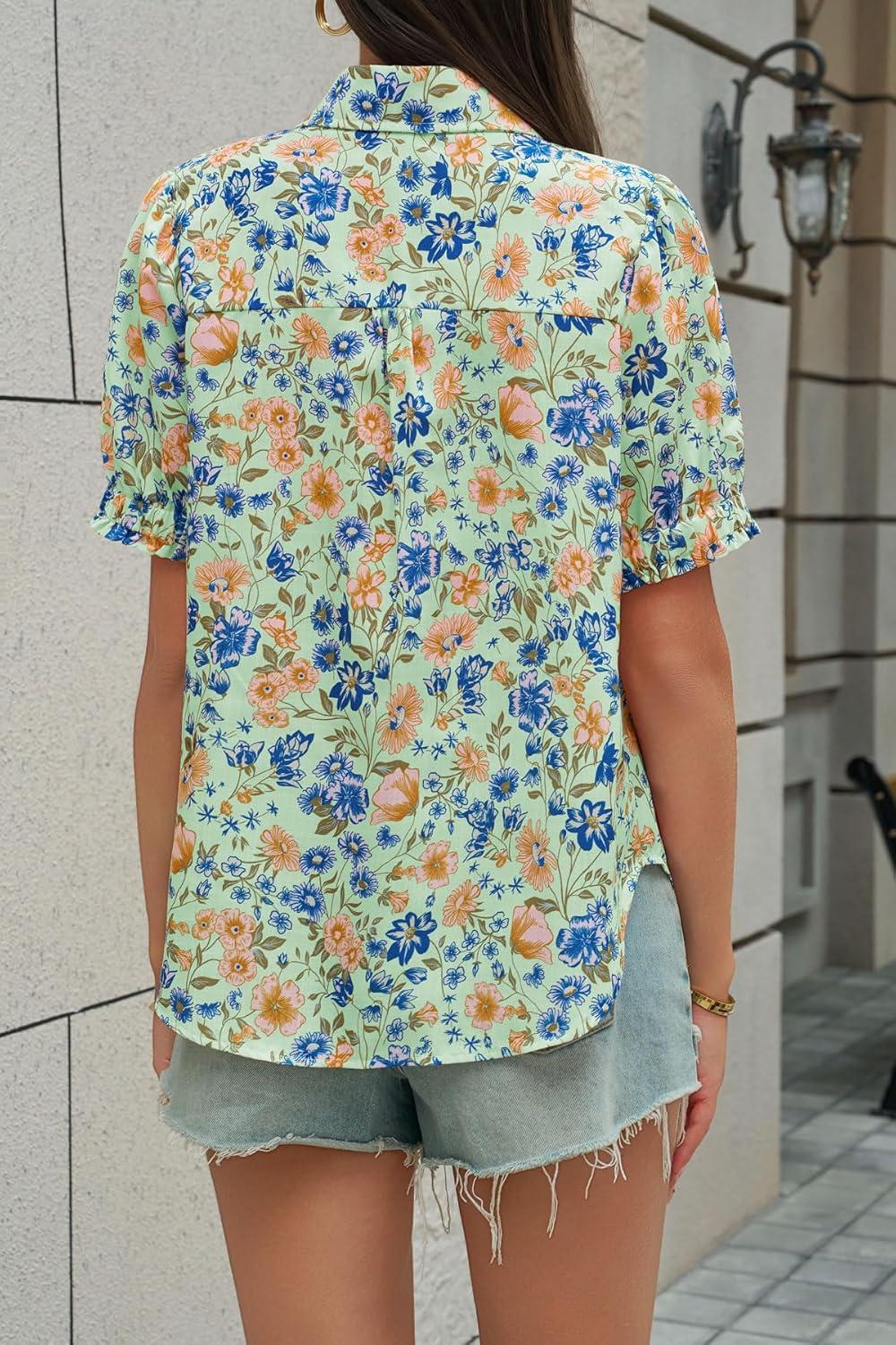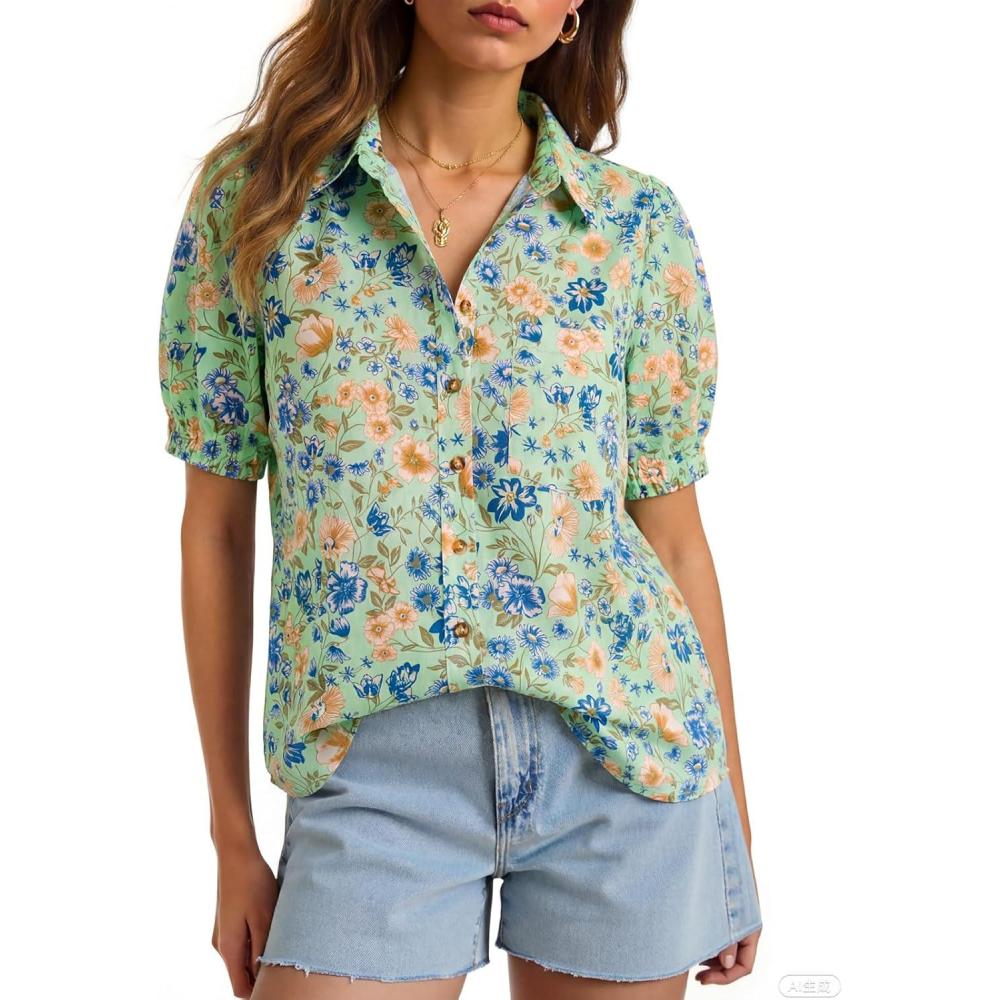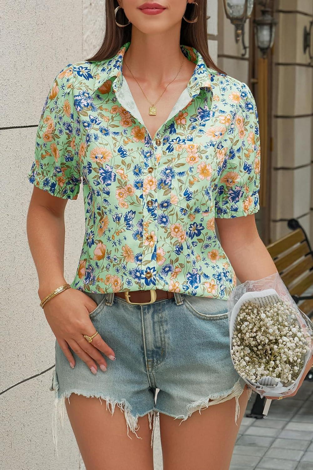 Cicy Bell Womens Floral Printed Button Down Shirts Summer Casual Puff Short Sleeve Collared V Neck Blouses Work Tops(Green)