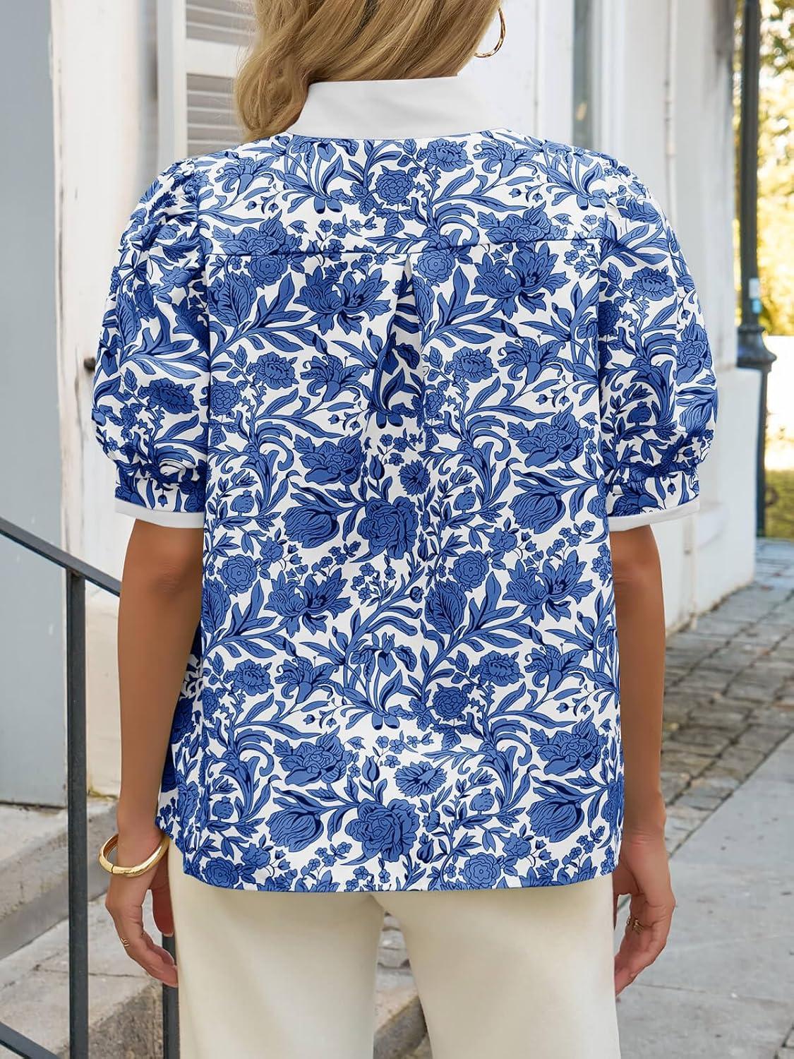 Cicy Bell Womens Floral Short Puff Sleeve Tops V Neck Patchwork Boho Summer Blouses Dressy Casual Shirts(Blue)