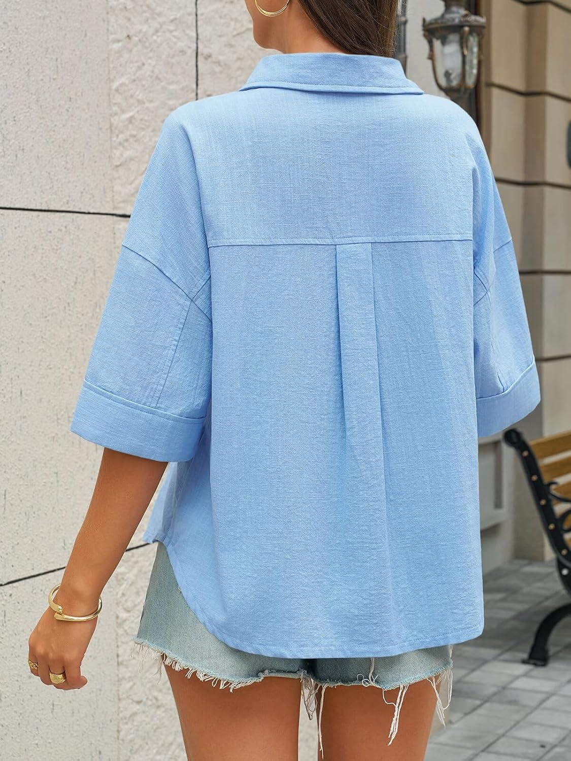 Cicy Bell Womens Linen Button Down Shirts V Neck Summer Short Sleeve Tops Casual Loose Fit Cotton Collared Blouses(Sky Blue)