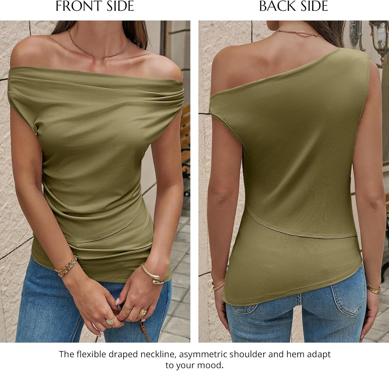 Cicy Bell Womens Off One Shoulder Tops Cowl Neck Ruched Tank Tops 2026 Summer Asymmetrical Going Out Sleeveless Shirts(Army Green)
