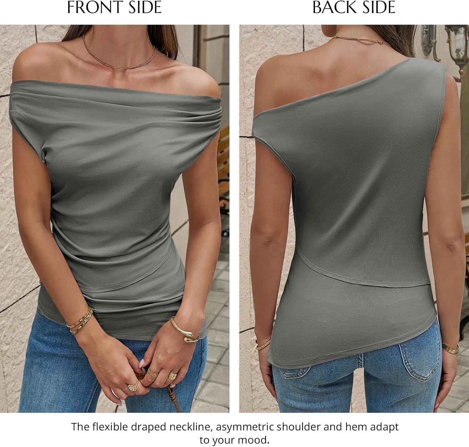 Cicy Bell Womens Off One Shoulder Tops Cowl Neck Ruched Tank Tops 2026 Summer Asymmetrical Going Out Sleeveless Shirts(Grey)