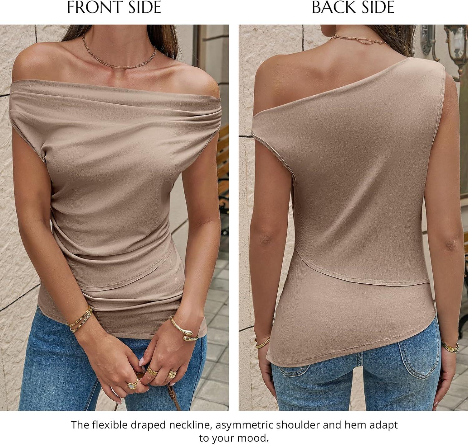 Cicy Bell Womens Off One Shoulder Tops Cowl Neck Ruched Tank Tops 2026 Summer Asymmetrical Going Out Sleeveless Shirts(Khaki)