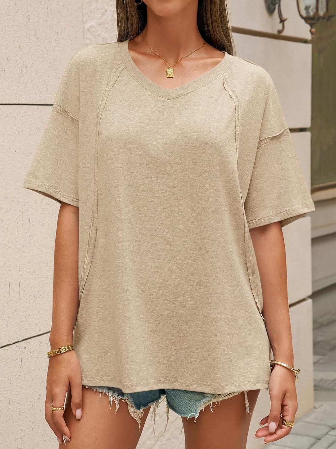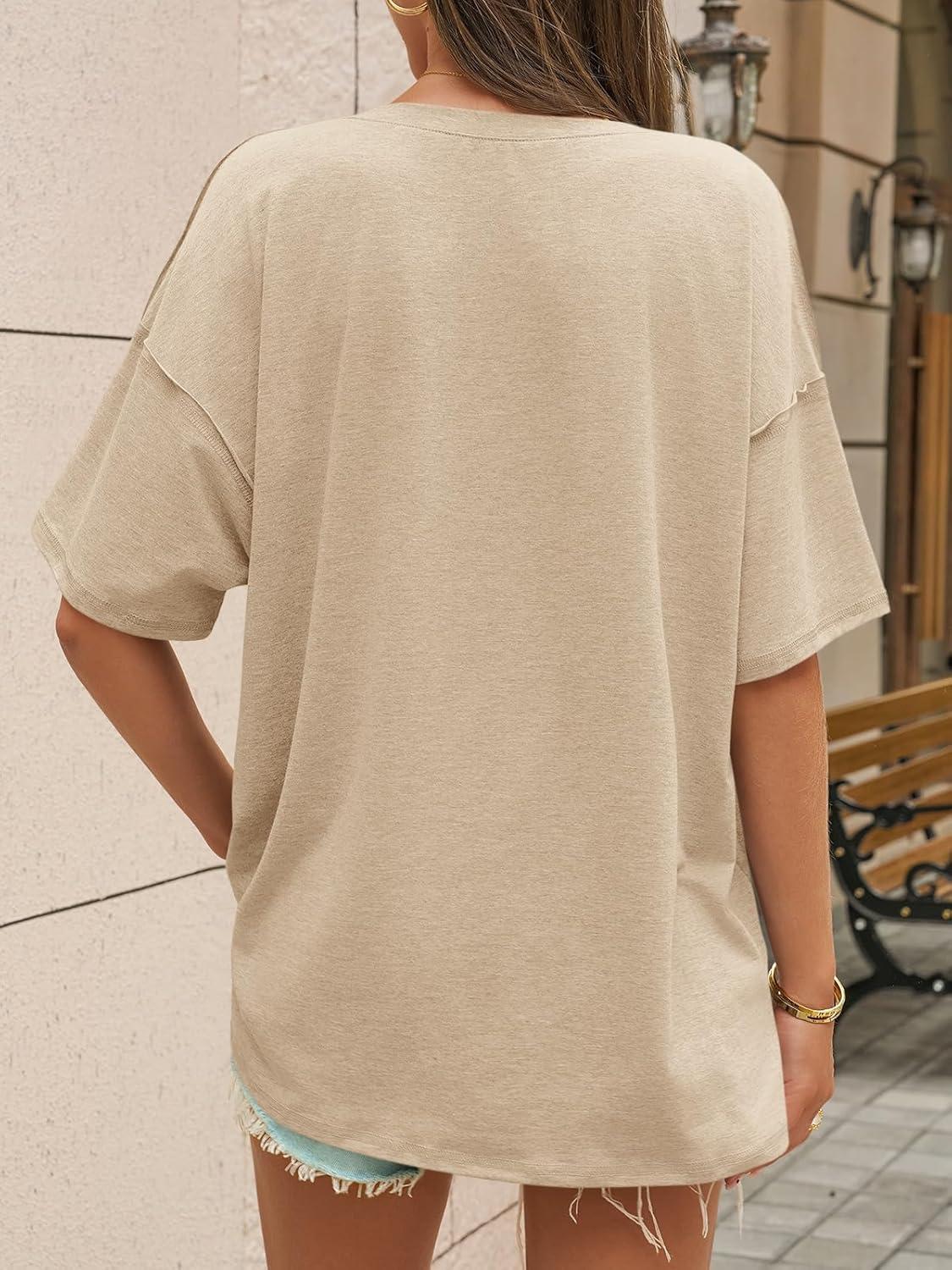 Cicy Bell Womens Oversized T Shirts Short Sleeve Summer Casual V Neck Tunic Tops Loose Fit Side Split Basic Tee Tops(Khaki)