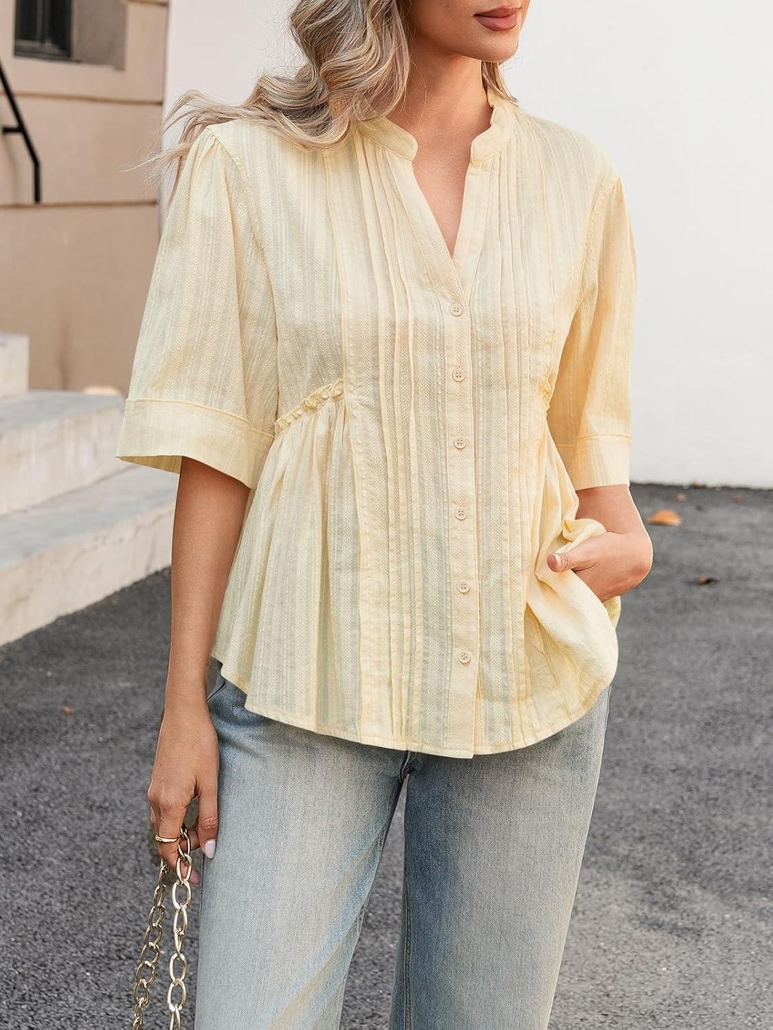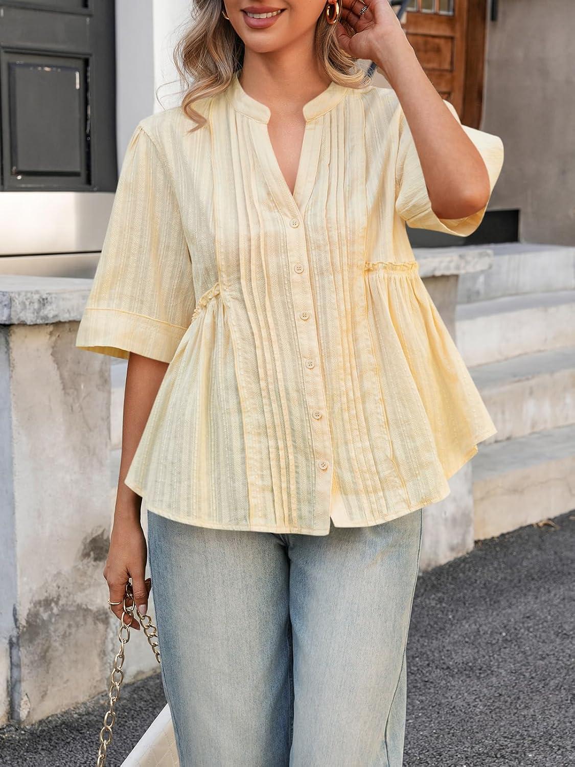 Cicy Bell Womens Peplum Button Down Shirts Summer V Neck Half Sleeve Blouses Dressy Casual Flowy Babydoll Tops(Beige)
