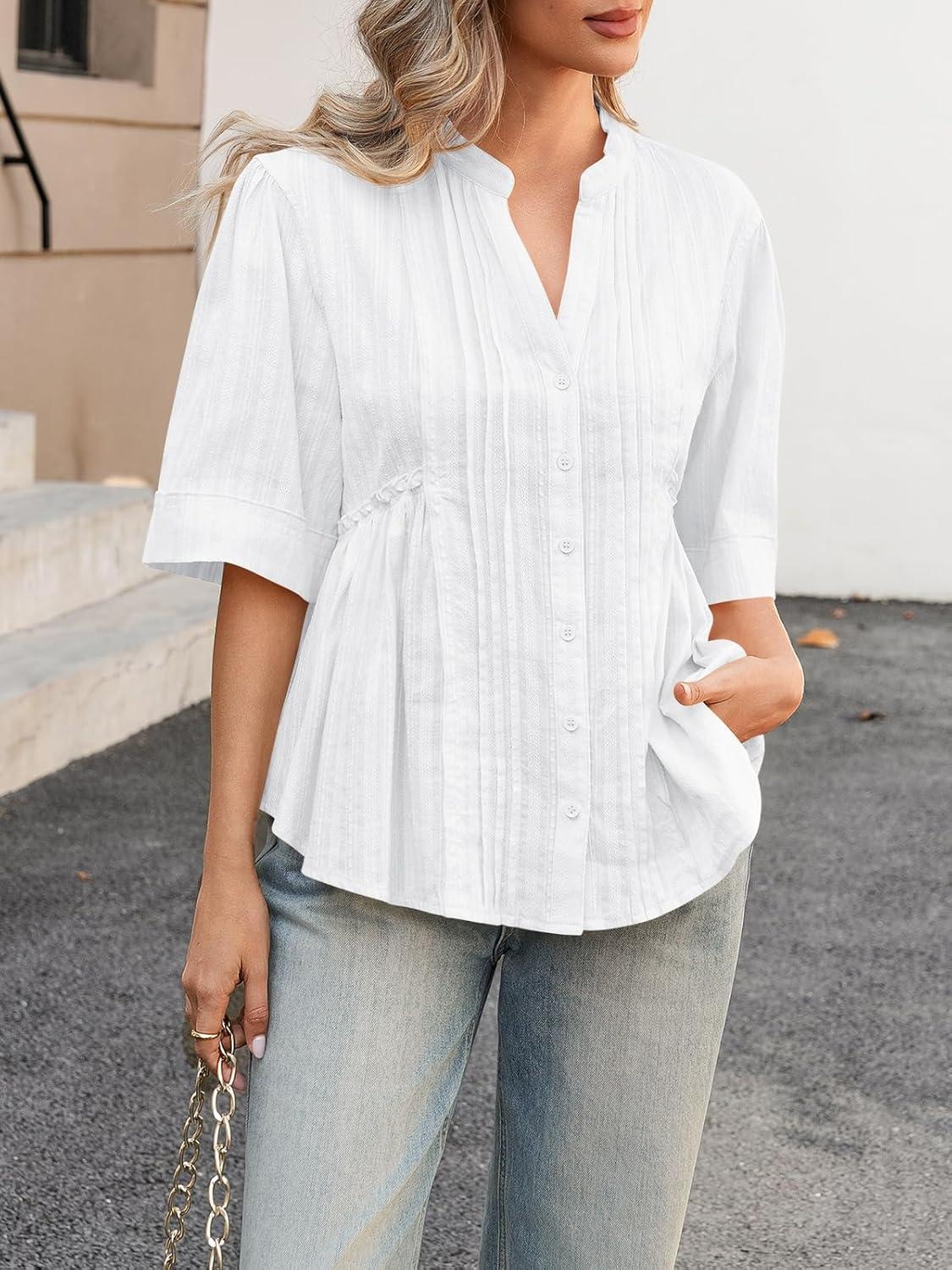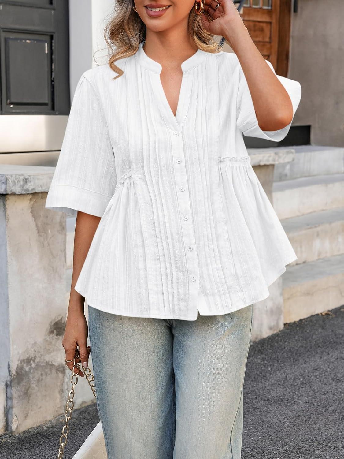 Cicy Bell Womens Peplum Button Down Shirts Summer V Neck Half Sleeve Blouses Dressy Casual Flowy Babydoll Tops(White)