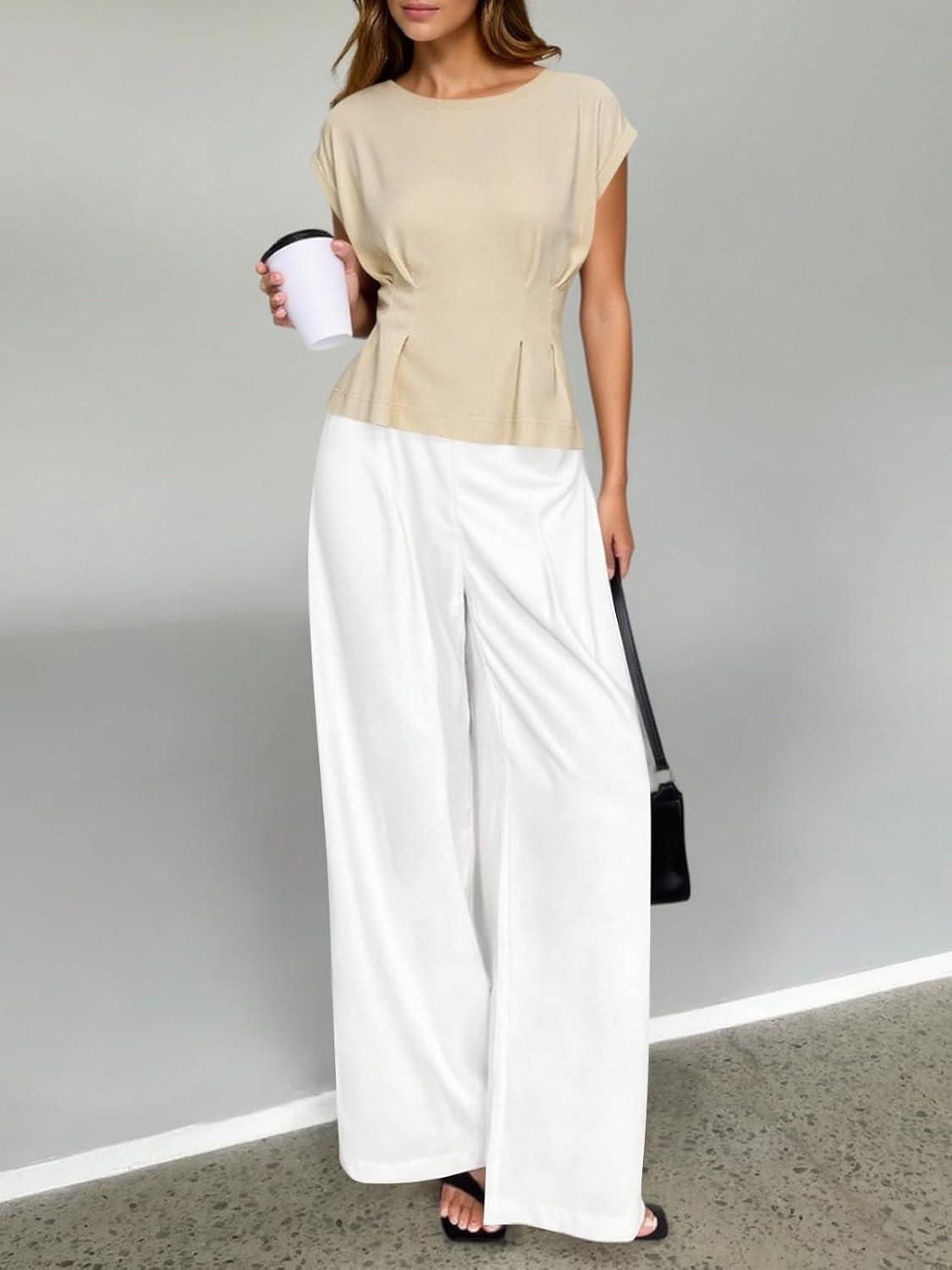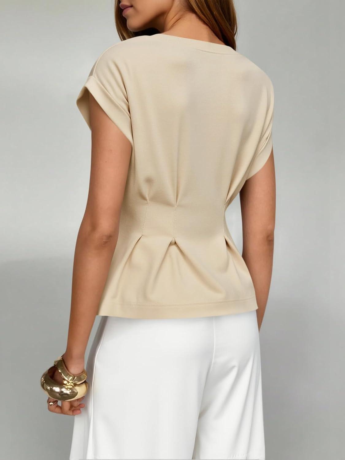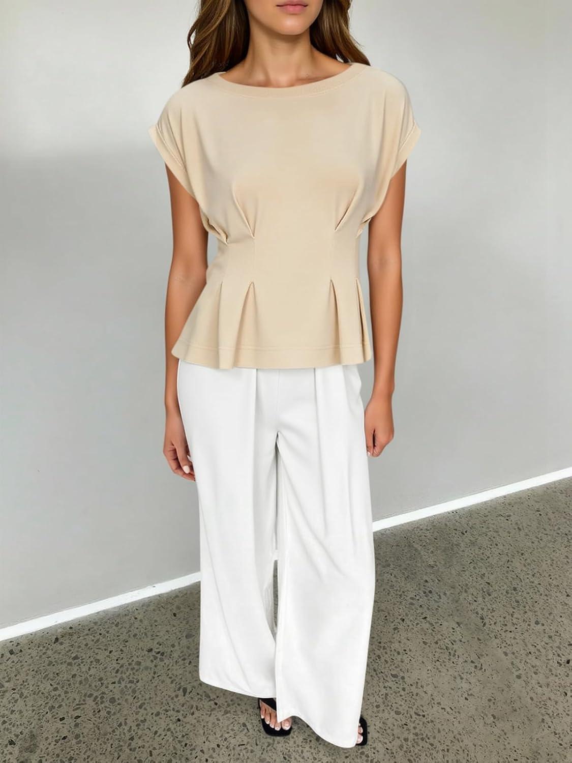 Cicy Bell Womens Peplum Tops Summer Babydoll Cap Sleeve T-Shirts Dressy Casual Crew Neck Pleated Blouses(Light Khaki)