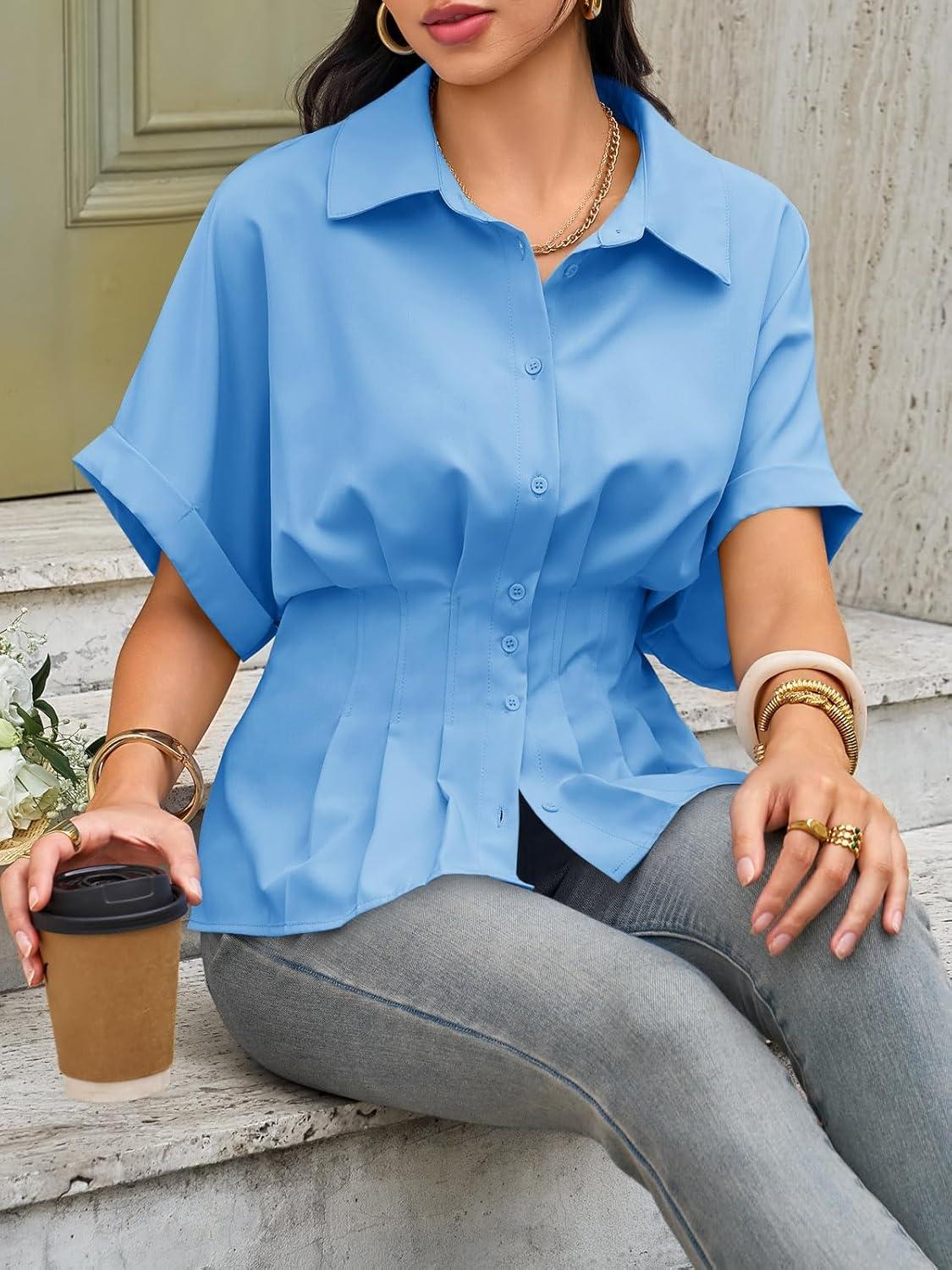 Cicy Bell Womens Pleated Button Down Blouse Summer Cuffed Short Sleeve Peplum Tops Casual Dressy Fitted Waist Shirts(Blue)