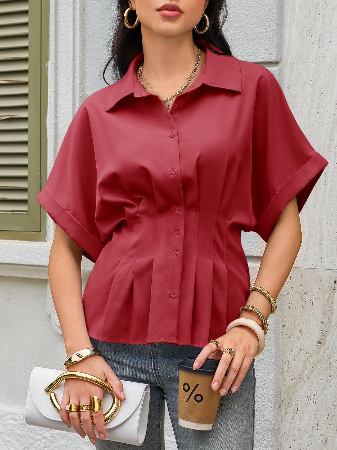 Cicy Bell Womens Pleated Button Down Blouse Summer Cuffed Short Sleeve Peplum Tops Casual Dressy Fitted Waist Shirts(Dark Red)
