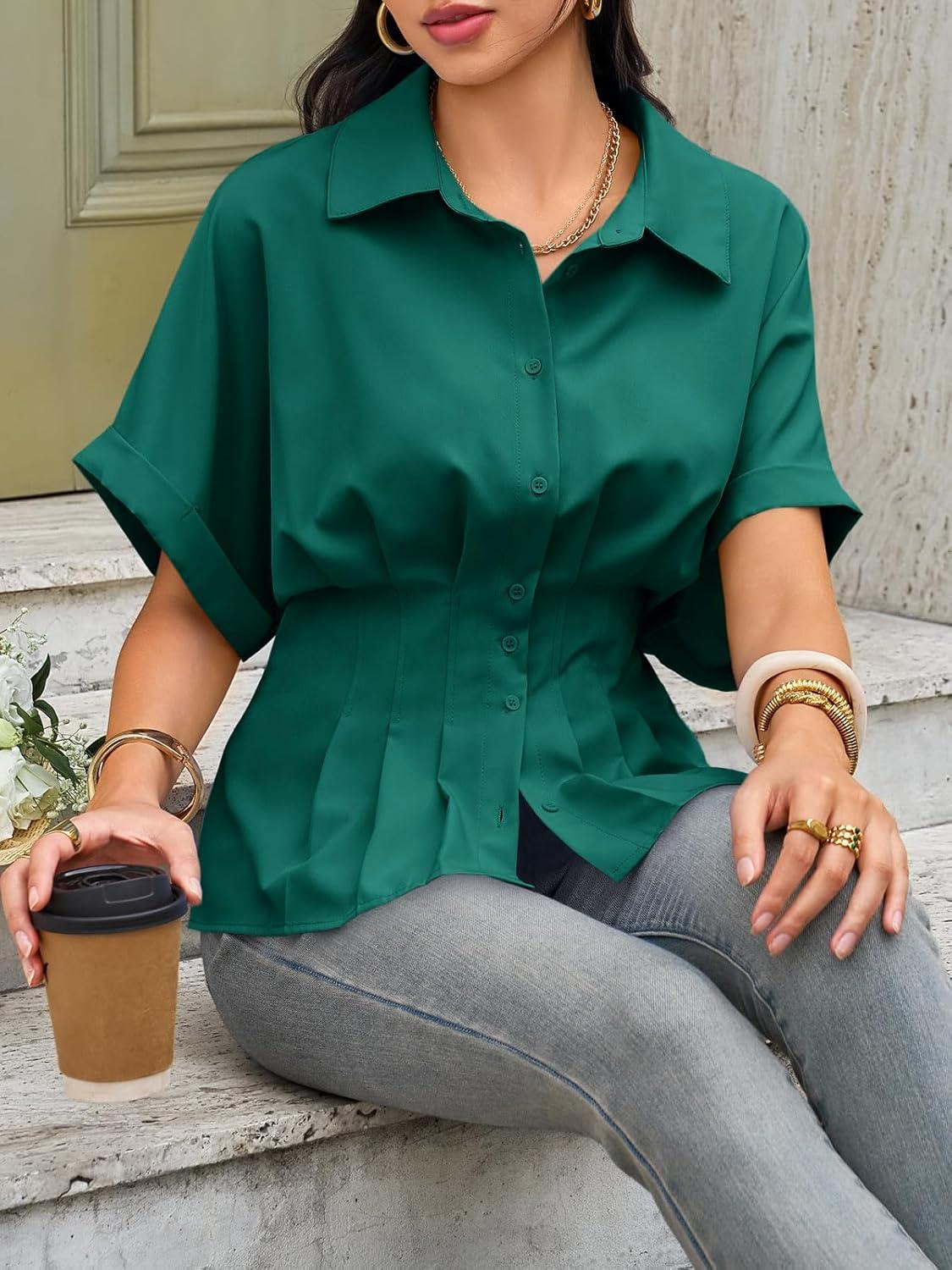 Cicy Bell Womens Pleated Button Down Blouse Summer Cuffed Short Sleeve Peplum Tops Casual Dressy Fitted Waist Shirts(Deep Green)