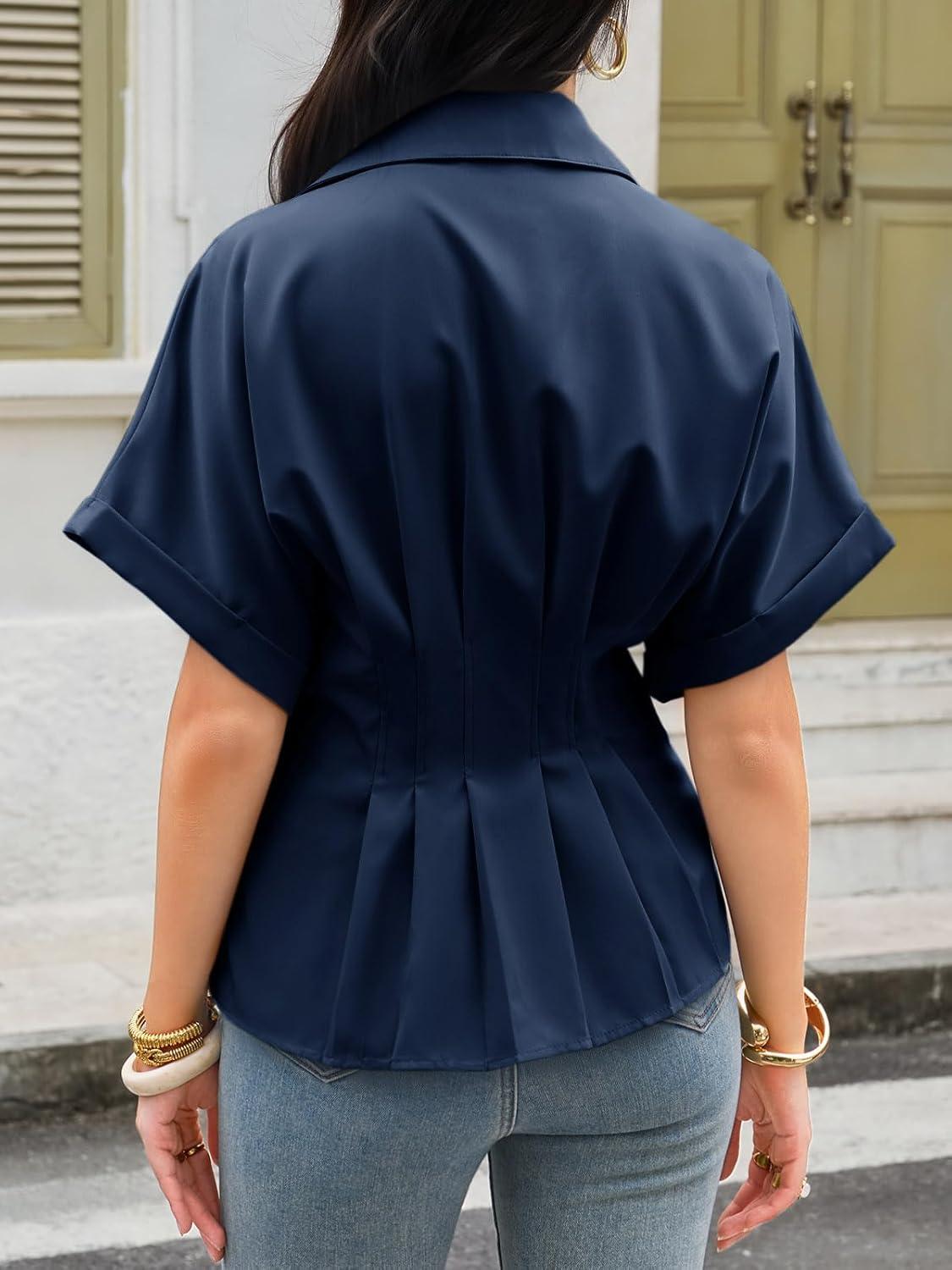 Cicy Bell Womens Pleated Button Down Blouse Summer Cuffed Short Sleeve Peplum Tops Casual Dressy Fitted Waist Shirts(Navy)