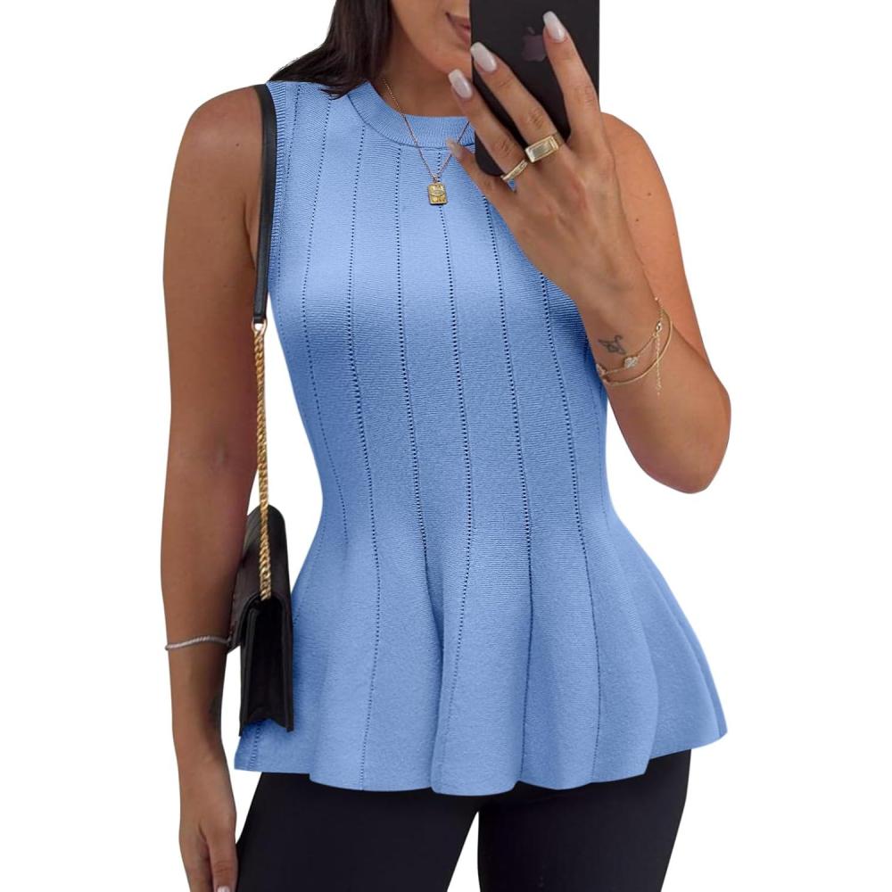 imageCicy Bell Womens Pleated Peplum Tank Tops Fitted Ribbed Knit Crew Neck Blouses Summer Sweater VestSky Blue