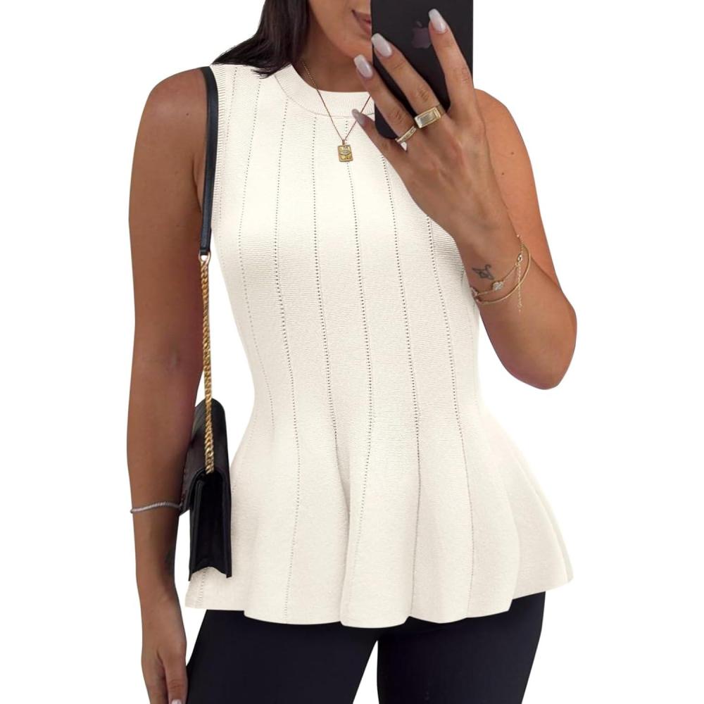 Cicy Bell Womens Pleated Peplum Tank Tops Fitted Ribbed Knit Crew Neck Blouses Summer Sweater Vest(White)