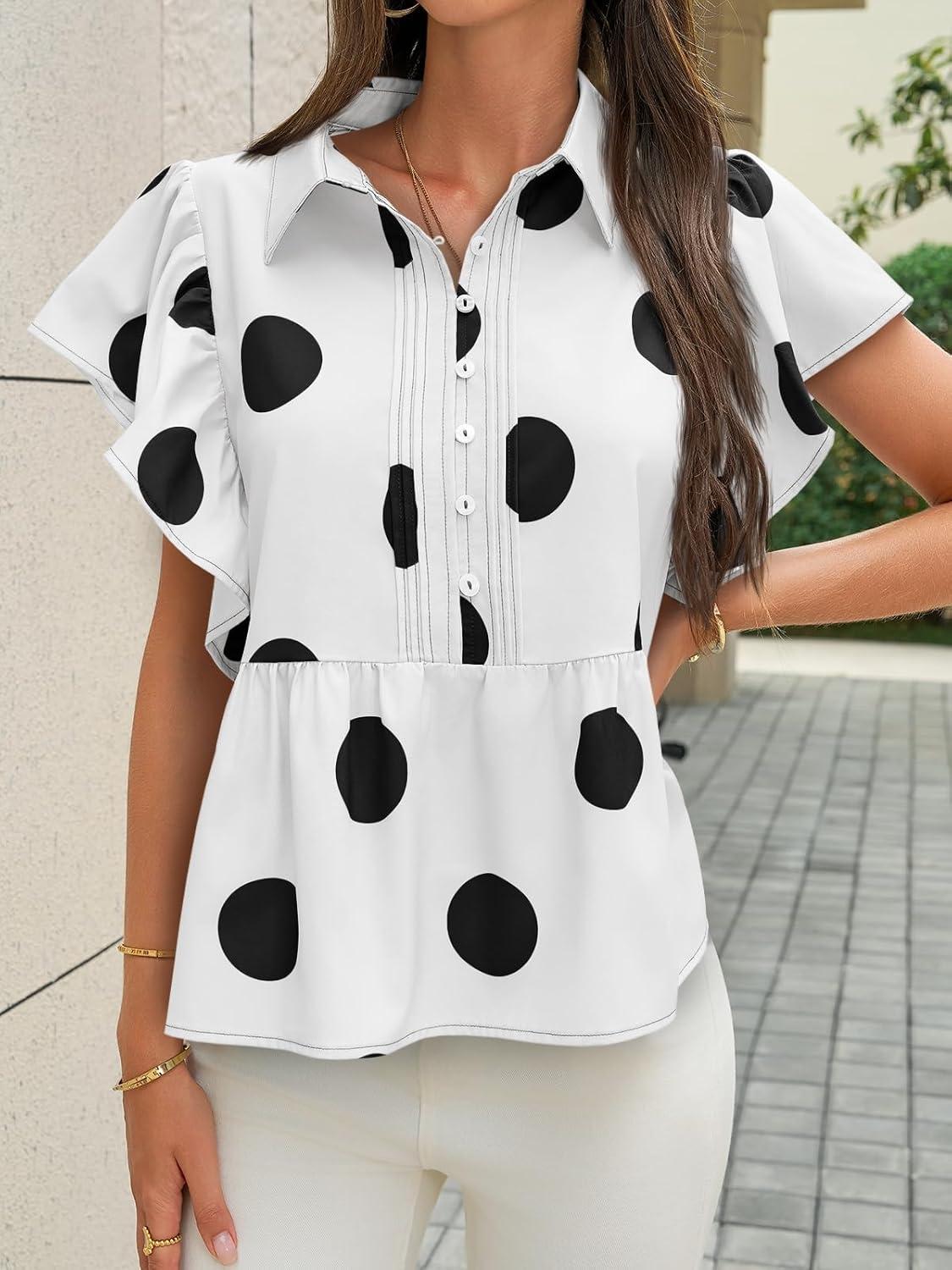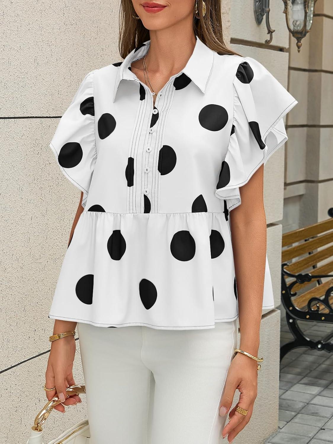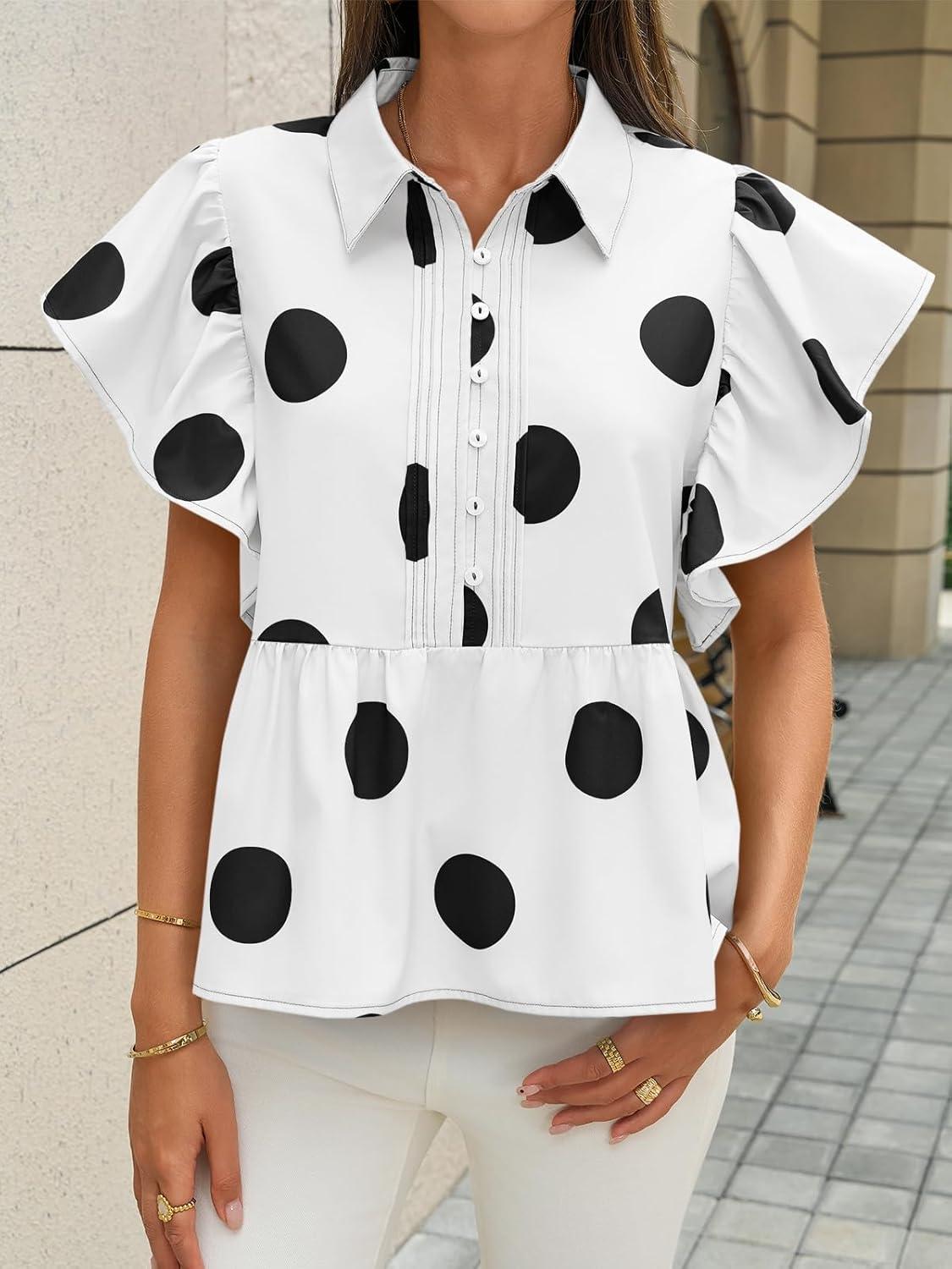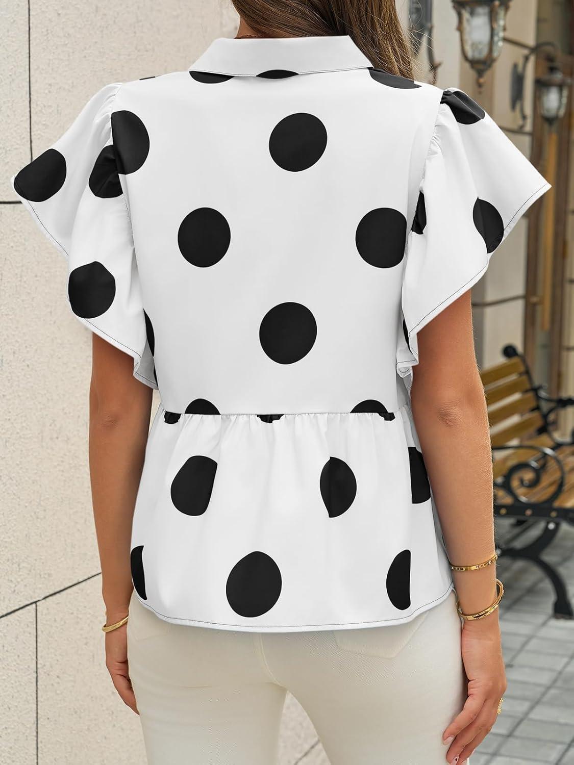 Cicy Bell Womens Polka Dot Babydoll Tops Peplum Ruffle Cap Sleeve Blouses Summer Casual Half Button Up Shirts(White)